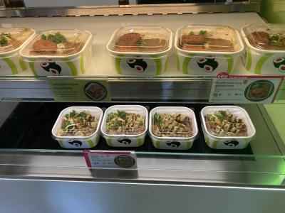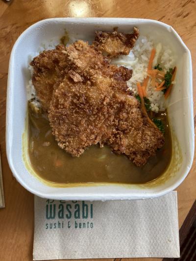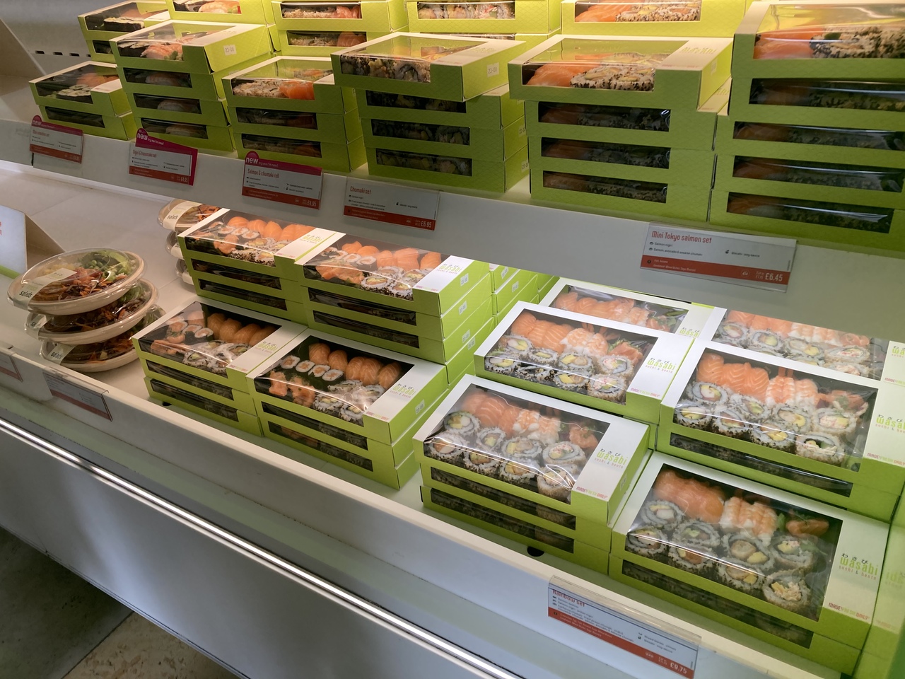 お寿司はサーモン握りやサーモンの鉄火巻き、アボガド巻きなどが中心で、白身のお寿司はほとんどなく、現地の嗜好向けと言えます。一方でカレーは日本のものにかなり近く、家庭で使うルーを使ったようなとろみのあるもので、少しスパイスの匂いもあります。以前は豆腐のカレーなどがメインだった気がしますが、現在はイギリスでのチキンカツカレーブームを受けてか、チキンカレーがメイン。チキンカツは、少し時間が経っているので、サクサクというわけではなく、コンビニ弁当で食べるようなカツのイメージ。市内中心部のお店とは異なり、その場でご飯をもってカツを乗せてカレーをかけてくれるお店ではなく、お弁当に詰められたものを販売。すごく美味しいとは言えないものの、満足感はあります。この他、bentoなる酢豚などがメインのお弁当もある。