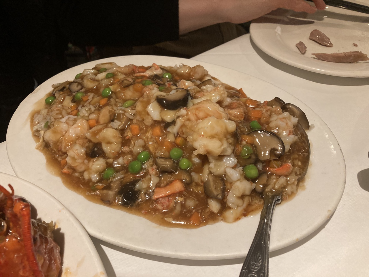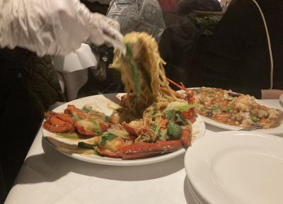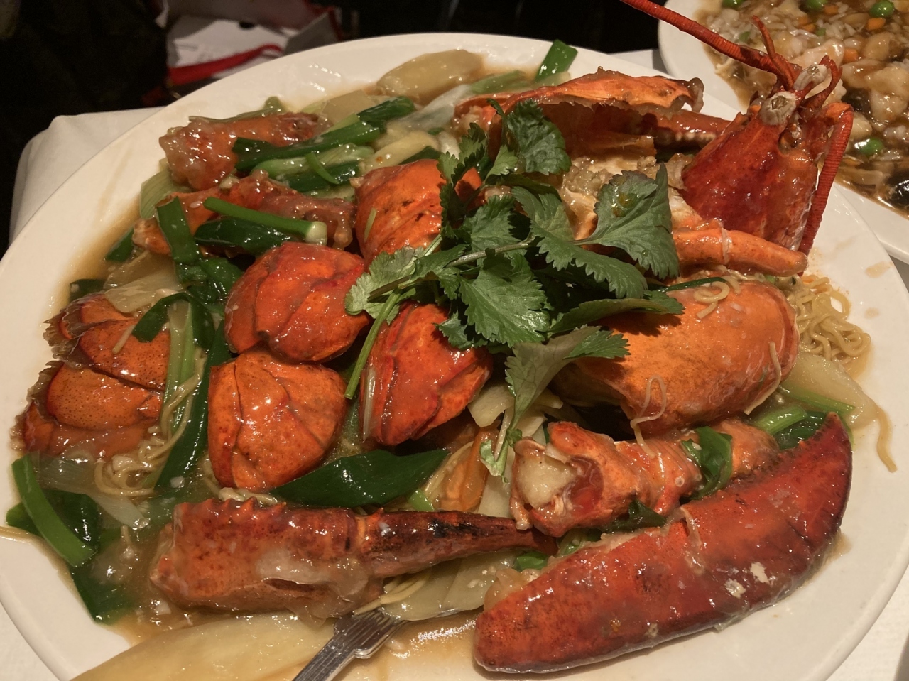 クインズウェイにある中華料理店。お店は丸いテーブルがぎゅうぎゅうに詰められた、隣の話し声は当然聞こえる、少し騒々しくもおる庶民的なお店。しかし、いつも満席で、待っでいるお客さんも多数。基本的に90分で終了なので、遅刻は厳禁。予約必須ですが、ネット予約はできないので、英語での電話予約ができないと厳しいかも。しかし、日本ではまず見ない、名物「ロブスターヌードル」は、絶対に食べたい逸品です。どのテーブルでも嘱んでいる人気メニューは時価。人数に合わせて麺の量、味付けを選択。今回はノーマルなネギ生姜と醤油味を選択。ロブスター食べやすい大きさにカットされていて、火の入れ具合もちょうどよく、パサしていない。ソースの絡み具合も素晴らしい。そのエキスをたっぷり吸った面倒なことももこれまた美味。