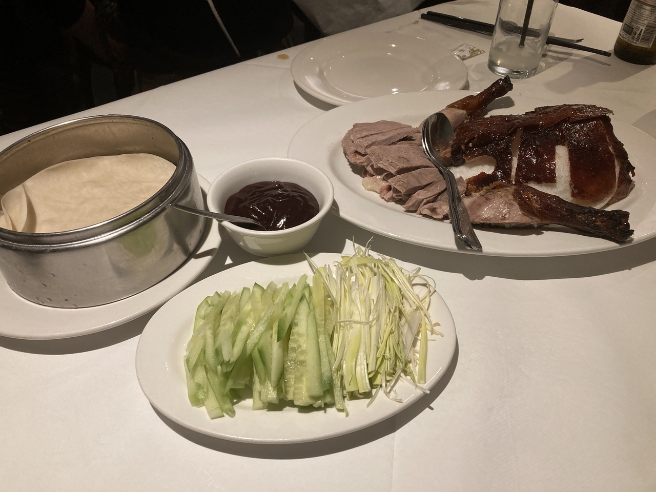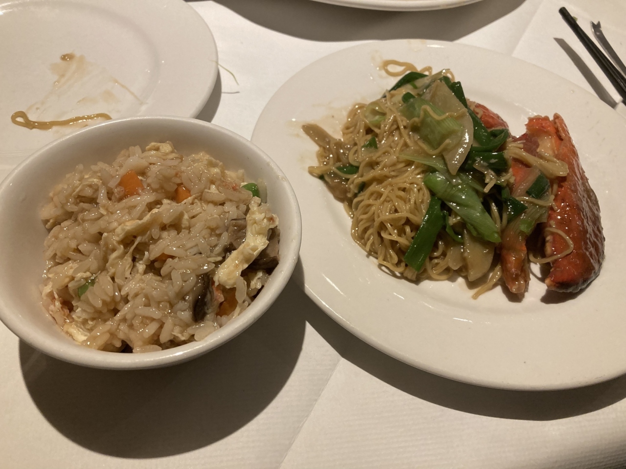 また、鴨肉の皮ではなくて肉を、北京ダックのように巻いて食べる「アロマ・クリスピーダック」も名物だが、北京ダックもリーズナブルなので、今回はこちらをいただく。北京のお店と同じように、皮に加えて肉も食べるスタイルで、もちろん自分で巻く。こちらもかなりのボリュームがあり、これがメインを張れてしまう。福建炒飯も美味。