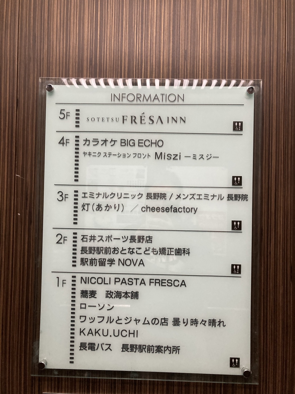 JR長野駅善光寺口、長電長野駅から徒歩すぐのところにあるシティホテル。ホテルサンルートからリブランドされたホテルで、2010年に再開発されたビルに移転したとのこと。11階建ての雑居ピルのうち、5階以上がホテルで、1階から4階はコンビニやカラオケ、居酒屋、英会話教室、クリニック、スポーツ店などが入っていて、よるホテルに向かう場合、ホテル以外のお客さんとも一緒にエレベーターになることになるのはマイナス点。5階にフロントがあり、チェックイン、アウトは、機械を使ったもの。アメニティは5階で調達駿河、歯ブラシだけは各階のエレベーターホールにもあった心配りは嬉しい。最近のホテルと同様、カードキーをかざすタイプのエレベーターで、さらに各階の入口にもカードキーをかざさないと入れないようになっていて、三段階のセキュリティとなっています。