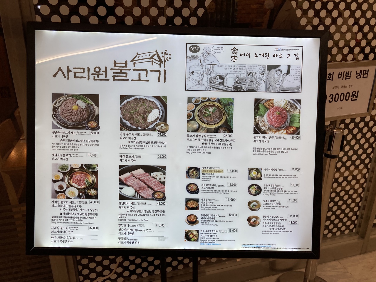 COEXMALLの飲食店街にある焼肉店。江南にある焼肉店の支店のようで、プルコギがメイン。現在の北朝鮮黄海側未知沙里院出身のおばあさんの味を引き継ぎ、糖尿病で苦労する夫のために砂糖を使わず、12種類の野菜や果物の甘みから味付けしたタレ漬け込んだ熟成されたお肉(プルコギ)で、見た目よりもあっさり。ベタベタした甘さがないので、お肉の味も味わえ、ついついご飯も進みました。一人で訪問したところ、少し嫌な顔をされましてが、あまり混雑していなかったのか、すんなり入れました。