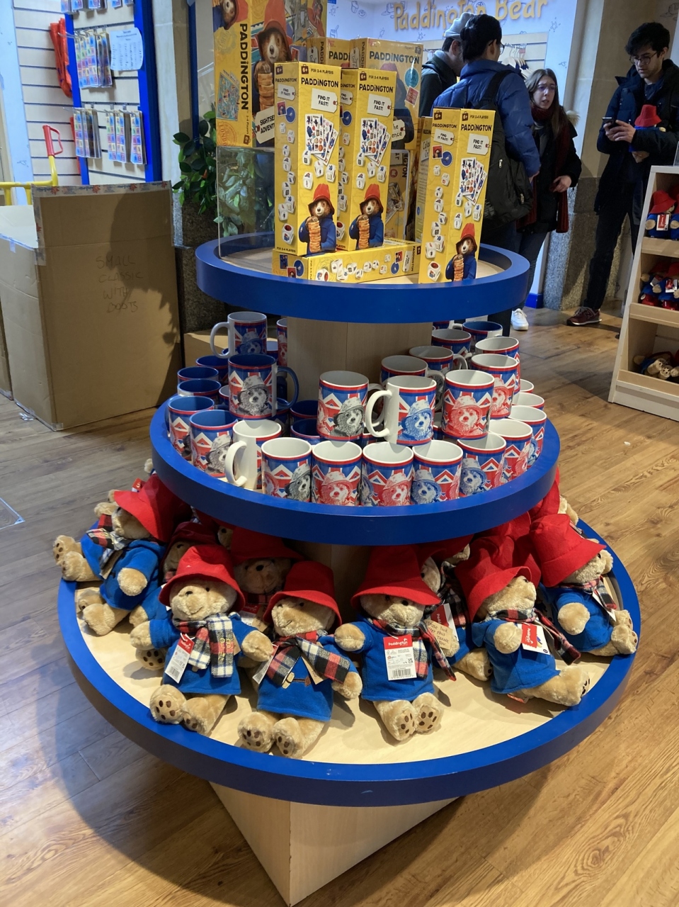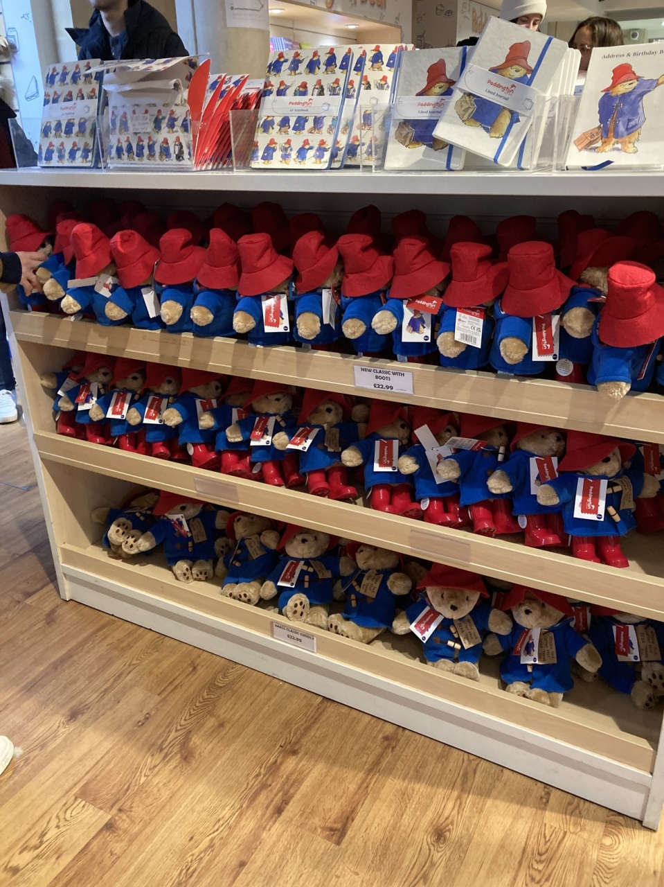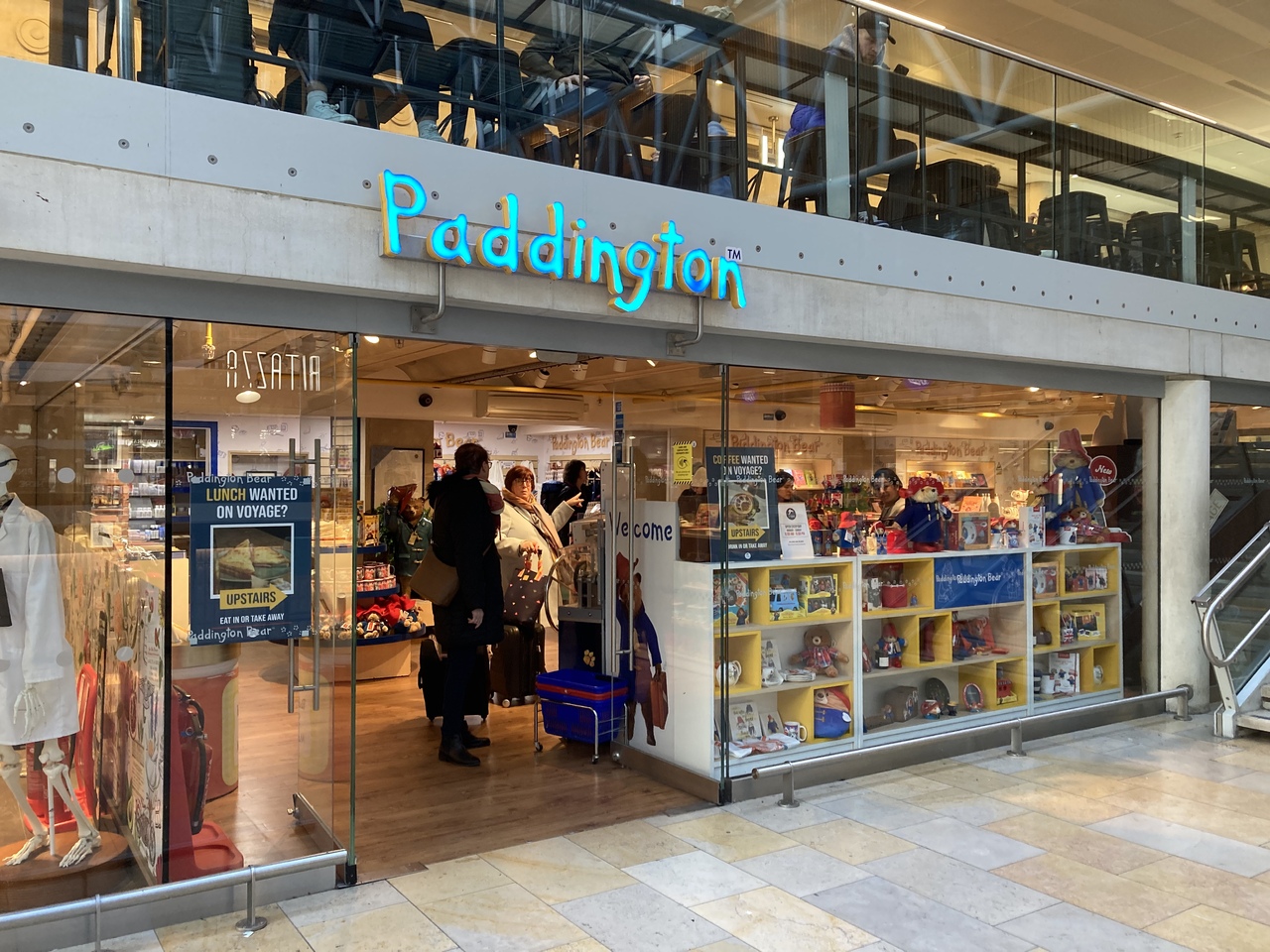 70の作品が30の言語、全世界で3000万部、日本では1967年から刊行されているイギリスの作家マイケル・ボンドの児童文学作品「くまのパディントン」の公式ショップ。パディントンの聖地、パディントン駅の構内のショッピングフロアの東側にあり、月~金は朝7時半から21時までと、開いている時間も長い(土日は9時オープン、日曜は19時クローズ)。店内は、広く、パディントングッズが多数(当たり前ですが)。やはり目を引くのは、大量のパディントンのぬいぐるみ。絵本バージョンと英語バージョン両方のグッズを販売しており、2022年に行われた故エリザベス女王即位70周年祝賀イベント「プラチナジュビリー」で注目を集めたエリザベス女王とパディントンの共演動画で出演したぬいぐるみ(もちろんそのものではない)も購入できるようです。