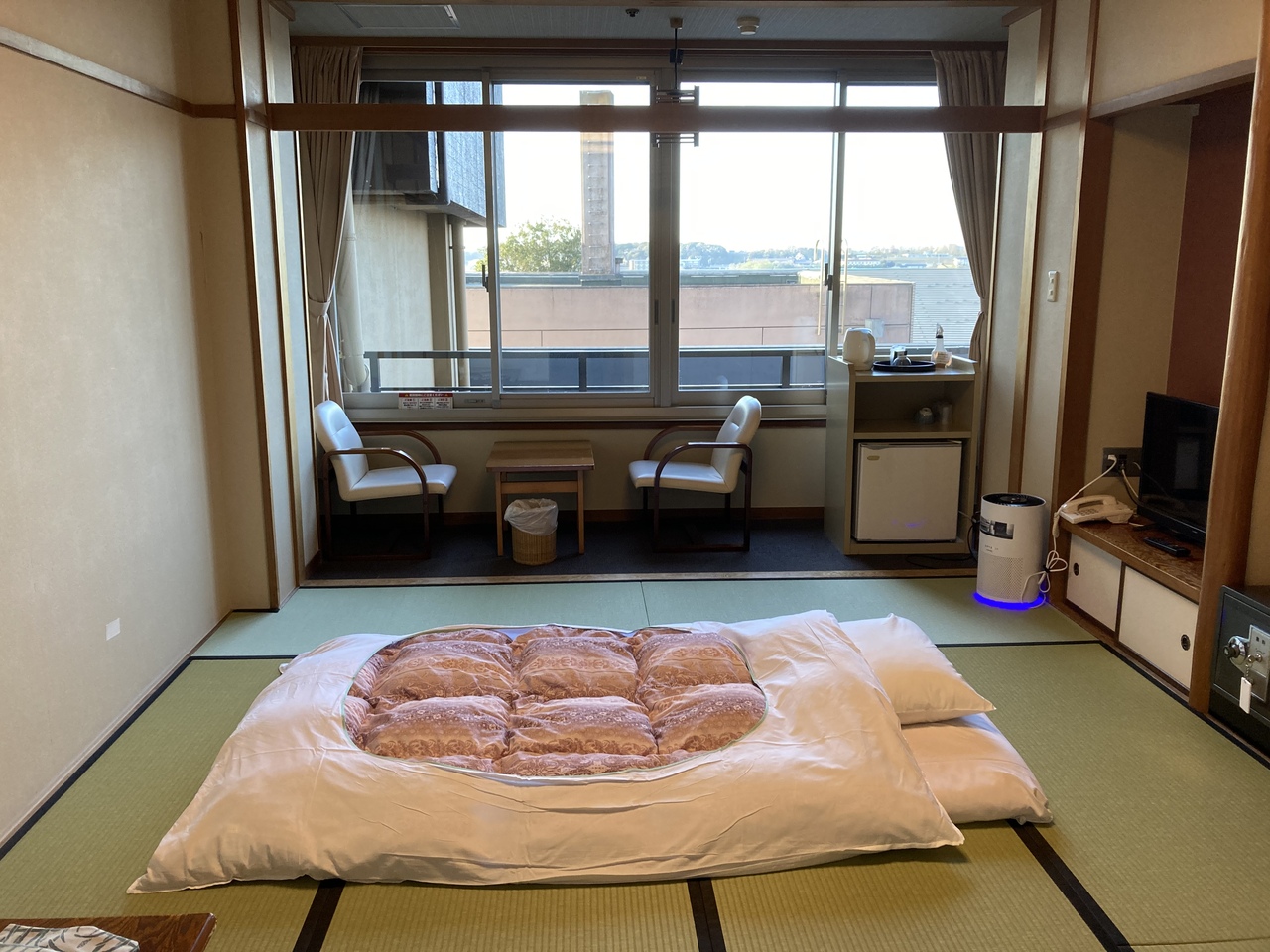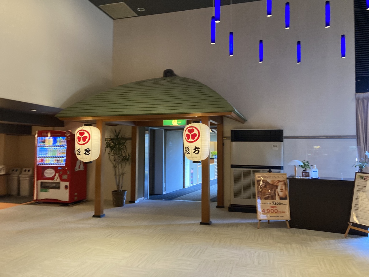ホテルに入ると、大江戸温泉物語特有の飾りがあり、靴を脱いでチェックイン、チェックインの際に、夕食、朝食の時間を決めますが、週末は結構混雑指定で、チェックインが遅いと、翌朝の朝食もやたら遅い時間を指定されることがある(バスの時間もあったので、無理を言って早めにしてもらった)。ファミリー層がメインですが、お一人様の利用も結構あるようで、一人で食事をされている方も結構いました。部屋は買収後あまり手を入れられていないのか、かなりくたびれている印象。スマホの充電に結構困りました。部屋に入るとすでに布団が敷いてあり(コスト削減)、コロナ感染防止の為、部屋のお菓子もなくなってしまいました。