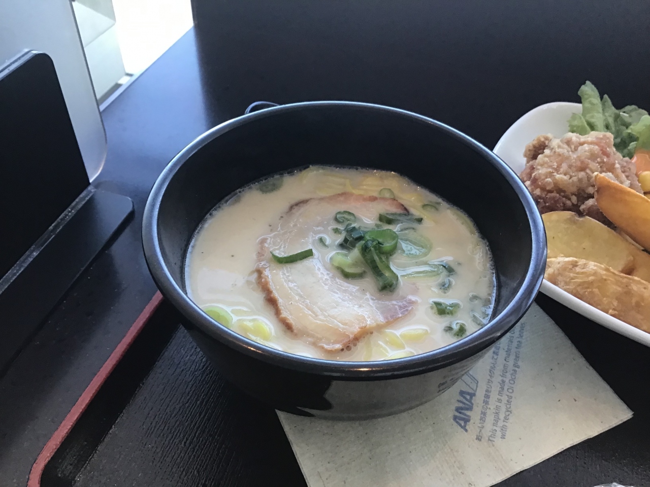 カレーは、JALのラウンジの方が数段レベルが上。美味しくないわけではないが、チキンのためか肉のごろごろ感や匂いなどはもう少し改良の余地ありかと。蕎麦、うどん、とんこつラーメン(、ベジタリアン向けのカレー)は、オーダー式で、温かいものが食べられる。とんこつラーメンをいただきましたが、有名店が監修したものではなく、麺は中太、スープはあっさり系でした。海外の空港と比べればレベルは高いが、JALへの対抗策が欲しい印象。とはいえ、サービスなので文句は申し上げません。- 旅行時期