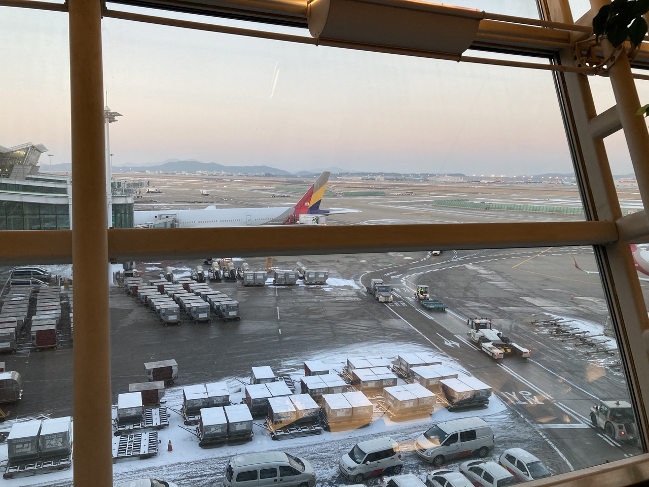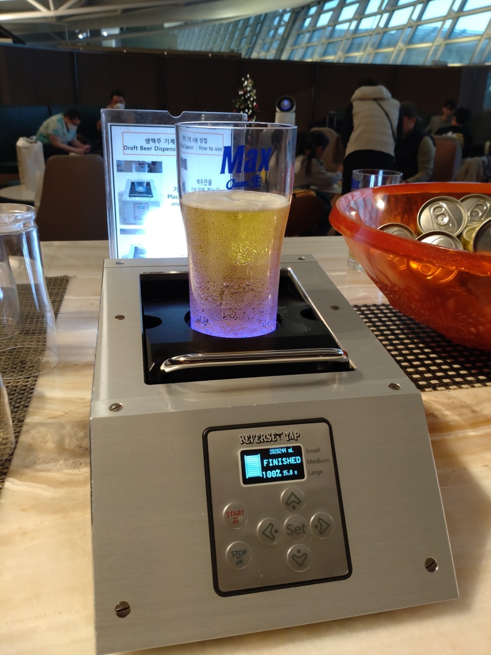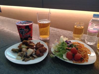 仁川国際空港第一ターミナルにあるアシアナ航空のラウンジ。アシアナ航空のラウンジは、ターミナル制限区域の中央と東側にあり、今回は搭乗口に近かった東側を利用。スターアライアンスのゴールドメンバーであれは、該当便なら利用可能。入り口は自動改札でチケットのバーコードを機械にかざすとゲートが開き開き入場できる。ラウンジ内は、広々として素敵な部屋ですか、個人用ブースがいつも混雑しているのは残念。コロナ禍が関係しているのが、新聞はなく、テレビもないので静かな空感。食事は種類は豊富ではありませんが、パスタや炒め物などがメイン。韓国料理はラウンジでは出しにくいのが、辛ラーメン(金浦空港のラウンシのように、空けていないのが良い)と唐揚げくらい。せめてライスとかキンパなどがあるとアジア人は喜ぶかと。飲み物の種類も多くはないが、お酒のカウンターは別のところにあり、生ビールのサーバーが日本にはない、コップの底から注ぐタイプで面白い。以前、大韓航空のラウンジを使ったことがあるが、こちらの方が落ち着いている気がする。もちろん、金浦空港のラウンジに比べたらかなり良い。