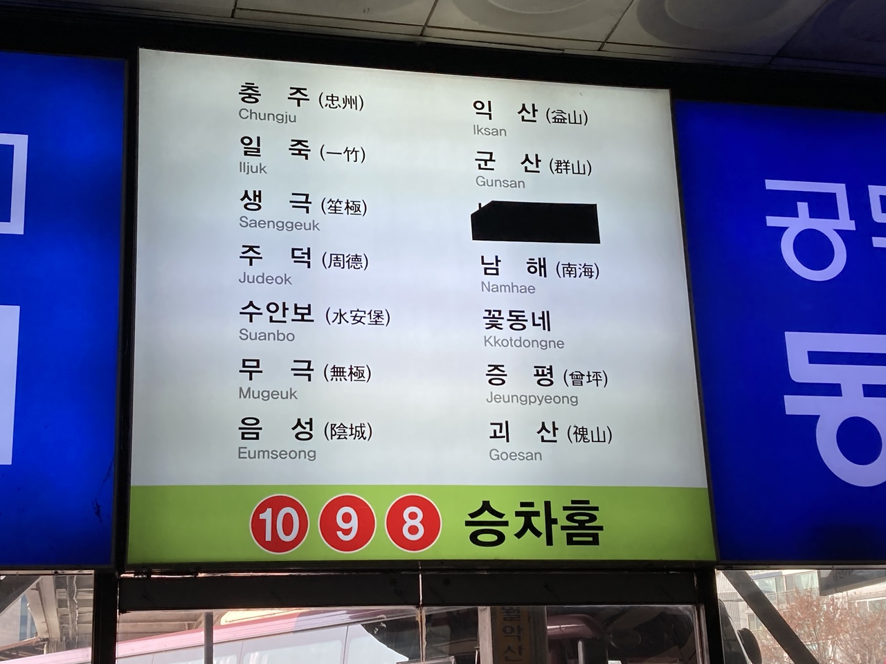 地下鉄2号線江辺(カンビョン)駅前にあるバスターミナル。ソウルには高速バスが発着する主要なバスターミネルが4つほどありますが、こちらは2番目に大きく、高速バスと市外バス(シウェボス)が発着することから「高速バスターミナル」とは呼ばず、「総合バスターミナル」と呼びます。ちなみに市外バスとは、日本で言う「都市間バス」で、2都市間をノンストップで結ぶ路線もありますが、多くは複数の経由地を通り、高速バスよりも時間がかかります。市外バスは1階、高速バスは2階から乗車券を買うシステムで、一部の自動券売機は日本語の標記もあります。