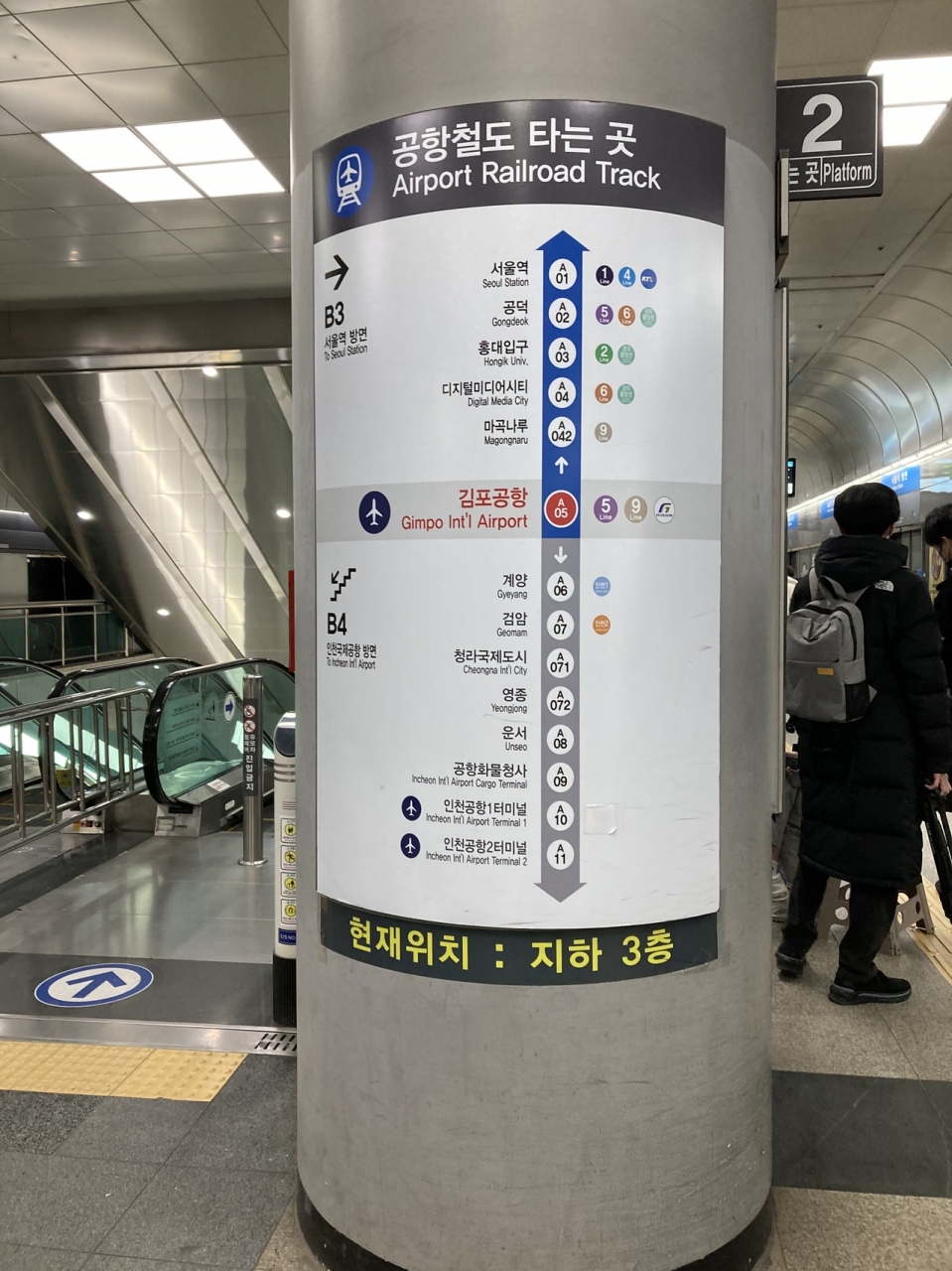 ソウル駅から金浦空港駅、仁川国際空港を結ぶ空港列車。仁川国際空港には概ね40分に1本、仁川空港第1ターミナルと第2ターミナルのみに停車する直通列車があり、第1ターミナルまで最短43分(第2ターミナルは51分)で結んでおり、バスよりも時間が読める点は有利。ただし、直通列車は、普通列車(ソウル~第1ターミナルまで約1時間かかる)4250ウオンの倍の9500ウオンかかる(空港バスよりは安いが)。また、孔徳(コンドク)駅、弘大入口(ホンデイック)駅など、市内中心部に向かう地下鉄との乗換駅には停まらないので、明洞あたりに向かうなら良いが、江南地区に向かう場合は不便。一方、金浦空港からの場合、直通列車は停らないがソウル駅まで22分(ただし、KORAILのソウル駅までは結構歩く)で、明洞方面ならAREX、江南方面なら地下鉄9号線か5号線でという使い方ができ、更に金浦空港駅は9号線と同じホームなので、江南方面から仁川国際空港に行く場合は便利。ただし、普通の地下鉄と同じような通勤車両で荷物置き場があるわけでもなく、結構な混雑のときもある。ソウル駅が中心部から少し離れていることもあり、やや中途半端。せっかくなら漢江を渡って江南まで結べは良かったと思うのは私だけか。