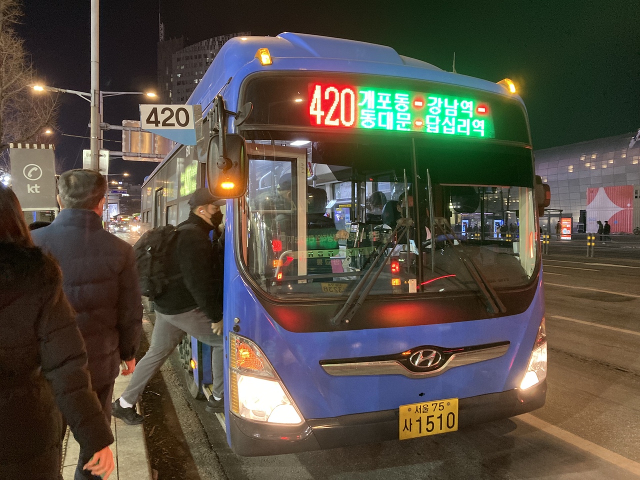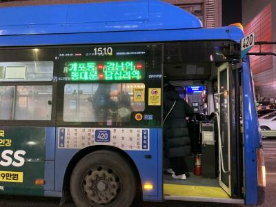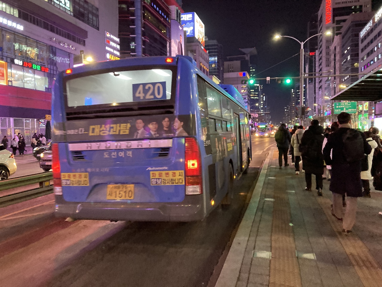 402番は市庁や南大門エリア、420番は東大門エリアの江北地区から、漢江を渡り江南地区を結ぶ路線バス。ちなみにソウルのバスは、路線や運行距離によって青、緑、黄、赤の4色の車体とバスの番号で路線を区別しており、こちらは3桁の路線番号で青色の幹線バスの一つ。比較的長い距離を走るのが特徴。ソウルは東京と同様、地下鉄路線が網の目のように張り巡らせていますが、真っ直ぐ繋ぐ路線は多くなく、必ずと言って良いほど乗換が伴います。こうした点で、402番は市庁、ソウル駅、南大門から、420番は東大門から、それぞれ漢南大橋を経由し、カロスキルのある新沙(シンサ)駅から、江南駅、良才(ヤンジェ)駅、清涼里駅に直結するバスは、非常に使い勝手が良い。また、漢江を渡るときの車窓も、地下鉄ではなかなか味わえないのでこれもまた良い。江南エリアでは、バス専用道路(名古屋の基幹バスのような感じ)を走るので、渋滞に巻き込まれることも少ない。路線図などはハングルのみで外国人には使いづらいが、概ね10分に1本くらいの運転なので、降りるところさえわかっていれば使える。ただし、私が乗車したバスは夕方のせいか結構な混雑でした。