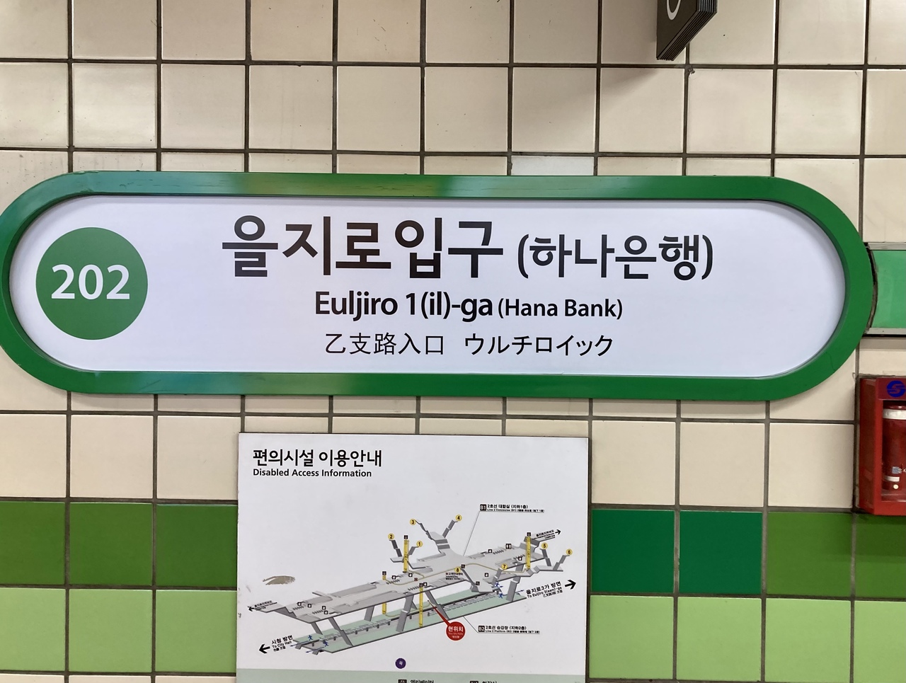 韓国・ソウル地下鉄2号線(グリーン)の駅番号202の駅。ソウル特別市庁と東大門歴史文化公園をつなぐ乙支路にある駅で、英語の駅名は、住所の乙支路1街の通り「Euljiro 1(il)-ga」となっています。また、韓国の大手、ハナ銀行の営業部が近くにある(本店は乙支路2街)ことから、駅名に「ハナ銀行」の副駅名がついています。
