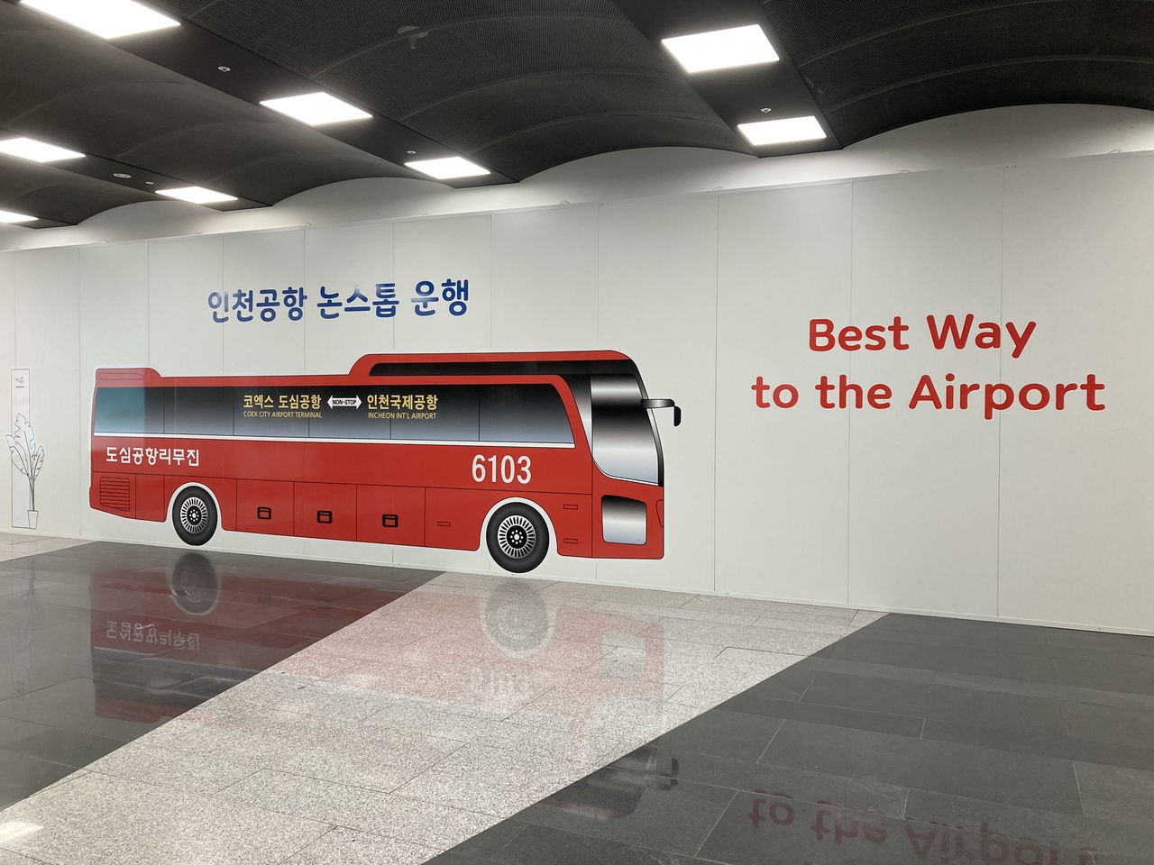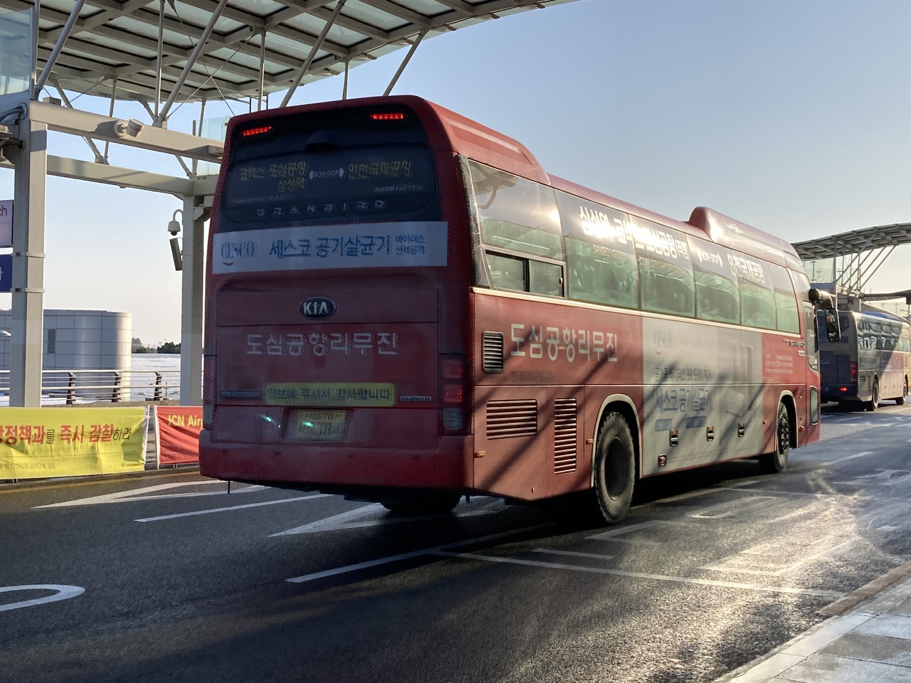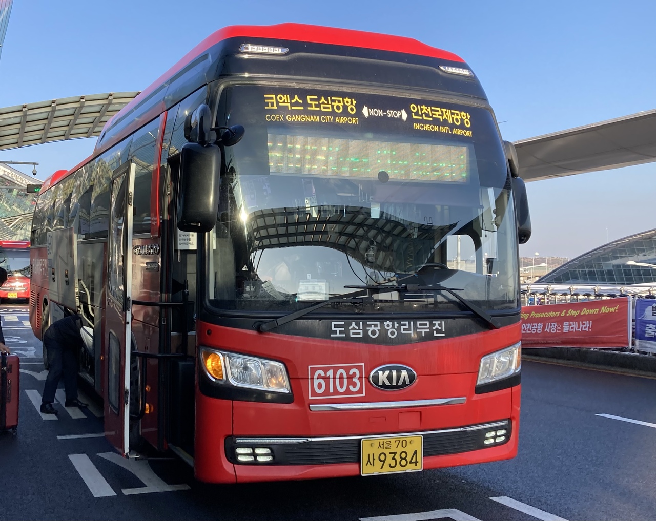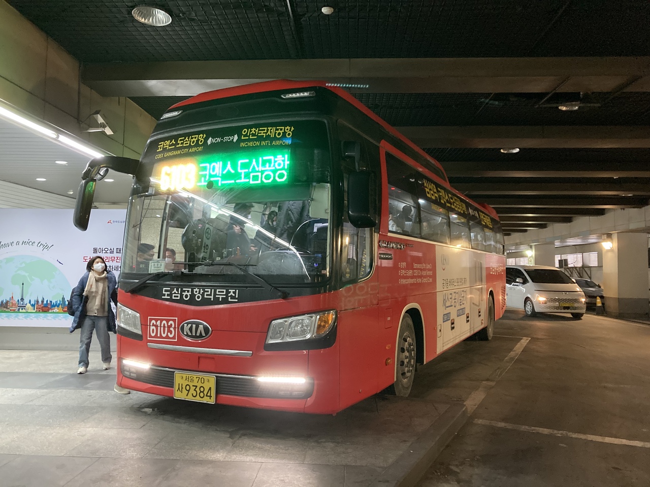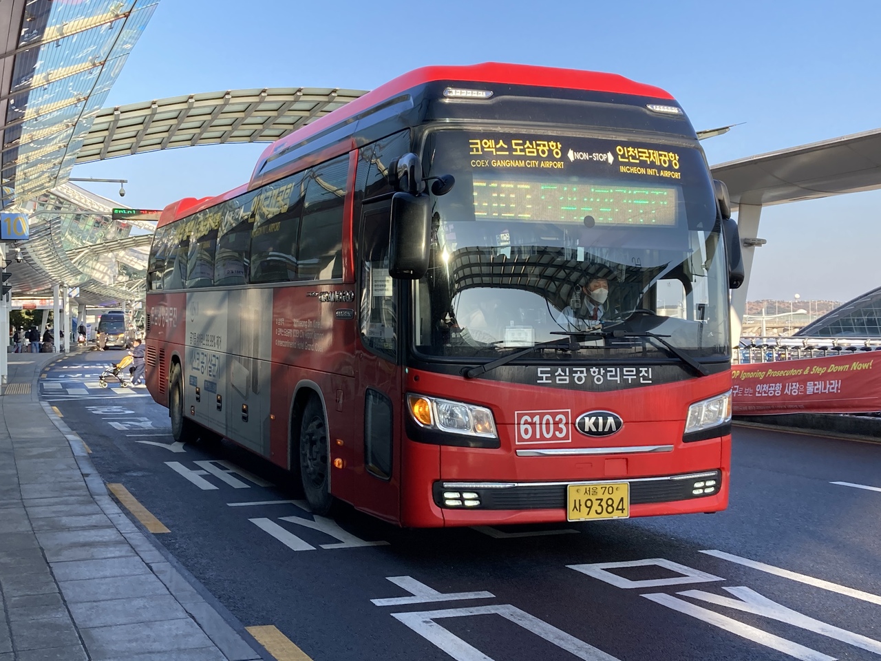 ソウル・江南の大型複合施設COEXにある江南都心空港ターミナルと仁川国際空港を結ぶ高級リムジンバス。江南はソウルの南東部にあり、仁川空港からAREX利用の場合、地下鉄への乗り換えが必要なため、特に荷物がある場合は不便で、時間もおおよそ100分かかります。一方で6103バス利用の場合、COEX~仁川空港第1ターミナルまでの所要時間が60~80分で便利。概ね30分おきに出ており、待たずに乗れるのも良い。まるで名鉄電車のような真っ赤なバスの車体が印象的。車内は三列シートで、座席もゆったりしています。