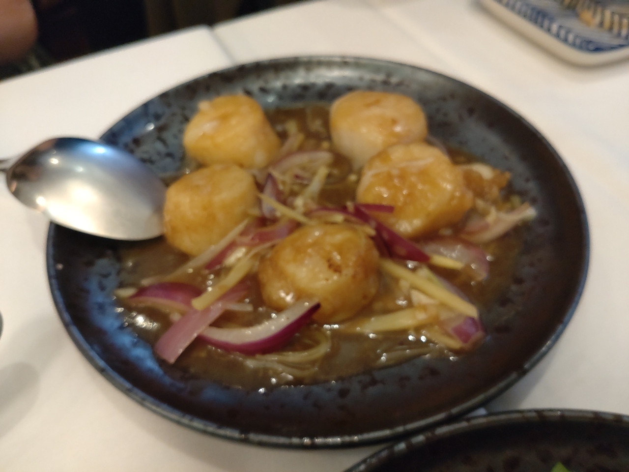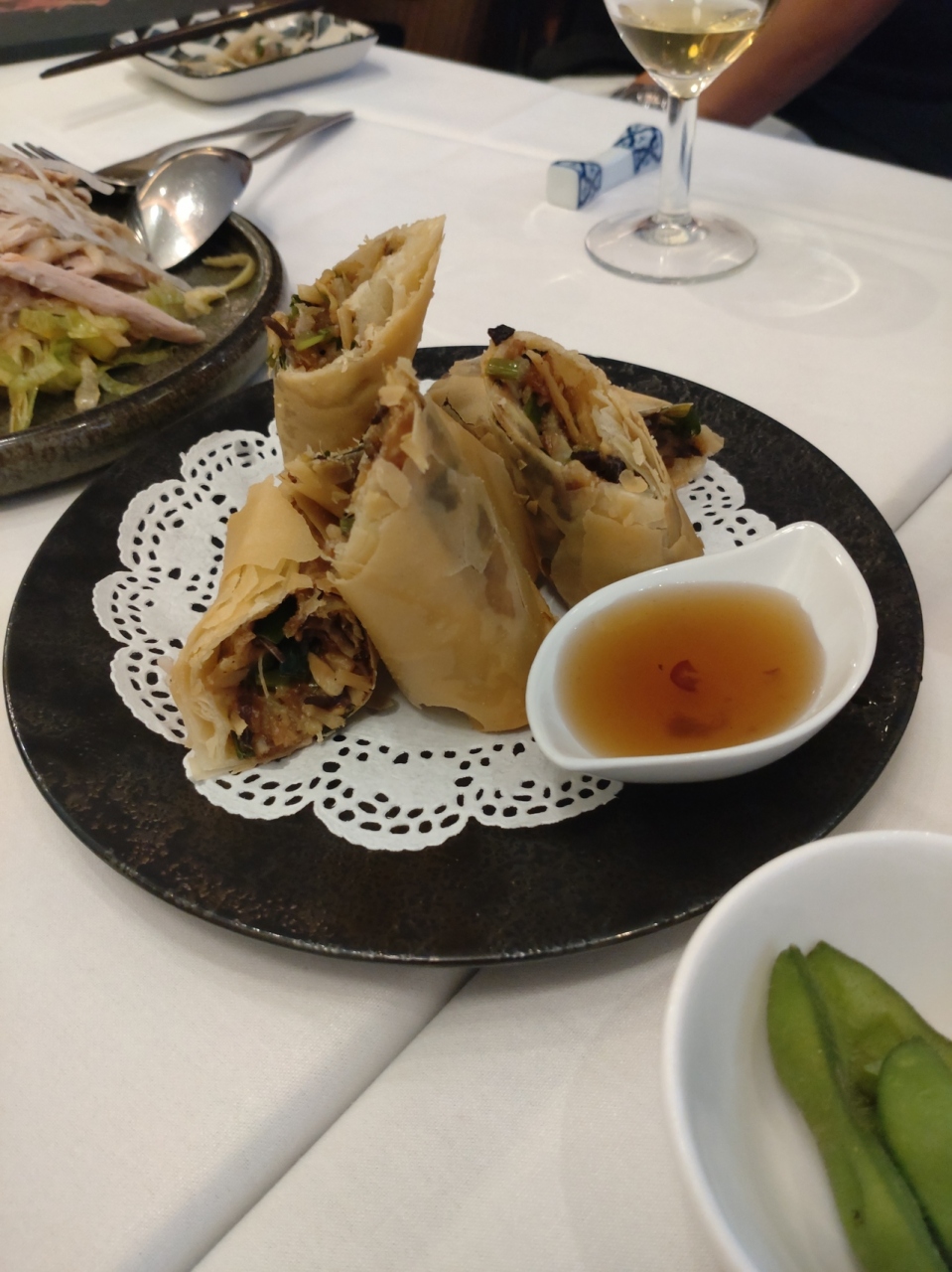 肝心の料理ですが、 餃子や春巻き、麻婆豆腐は日本と変わらぬ味。棒々鶏も日本で食べるものにかなり近い。一方で、日本ではおなじみの前菜はあまりなく(枝豆は美味だった)、チキンも唐揚げではなく大きなチキンを香ばしいものでしたが、日本人には少し大きめかも。ホタテを使った料理は、フランス料理で疲れた日本人の身体にもフィット。牛肉の黒胡椒ソース炒めは、ノルマンディー産のバベットステーキに濃い目のソースは、中華とも和とも言えないが、ご飯に合うおかずでした。