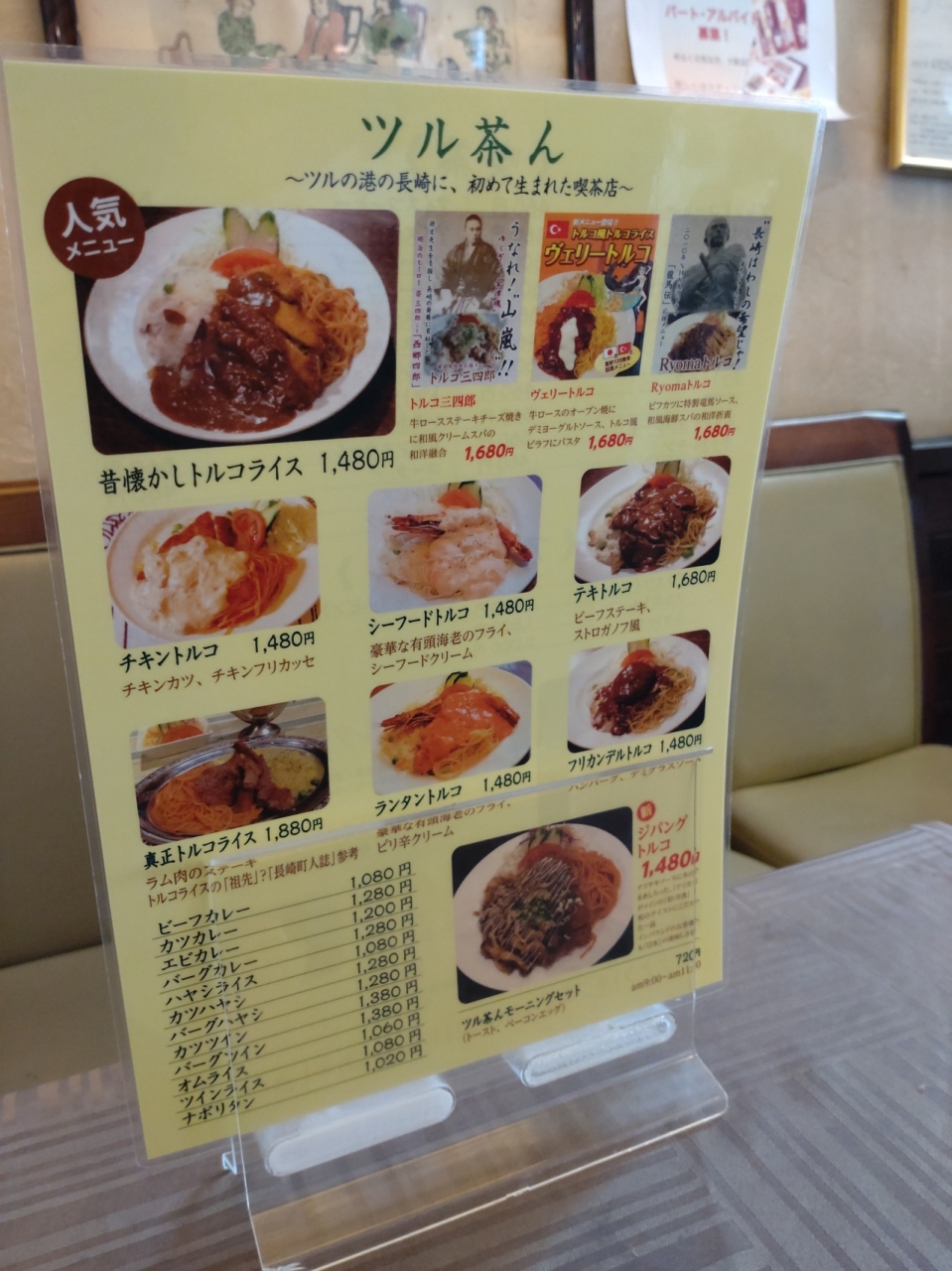 思案橋電停から浜町アーケード入口に向かい、アーケード入口から反対側すぐのところにある洋食店。創業大正14年、1925年創業の九州最古の喫茶店とも言われるお店で、トルコライスやミルクセーキが有名なお店。多くの来客や文化人、知識人で賑わったサロンのようなところでもあります。ちなみに、店名の「ツル茶ん」は、長崎港が「鶴の港」と呼ばれていることから、「鶴の港の長崎にはじめて生まれた喫茶店」という意味だそう。