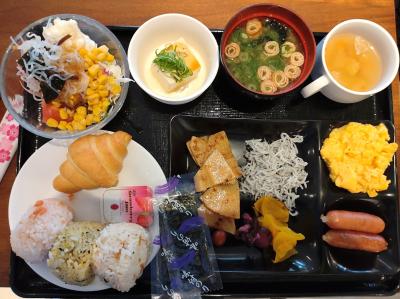 ビュッフェ式の朝食は無料なのであまり期待はしていなかったのですが、地元のしらすや卵をはじめおかずも数種類あり、焼き立てパンもあるなと充実している印象。朝食会場は、通常、ラウンジとして開放されており、ソフトドリンクはいつでも飲めるのも嬉しい。