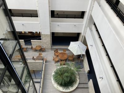 JR博多駅筑紫口から徒歩15分、バスで3分くらいのところにあるビジネスホテル。地下鉄空港線利用の場合、博多駅の一つ手前、福岡空港の次の駅の東比恵駅からも徒歩15分くらいのところにあります。エントランスは大きくありませんが、建物の真ん中が吹き抜けの形になっており、周りを囲むように部屋があるタイプ。エレベーターもスケルトンタイプで、単なるビジネスホテルかと思っていましたが、2階にテラスがあるなど、思っていたよりもリゾート感がある。