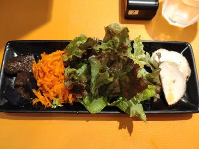 土日祝には、日替わりの前菜4品がつく「ランチセット」(カレー+390円)があり、今回はトッピングの温玉、トロ肉増、野菜がついて100円お得な「スペシャルフレンチカレー」のランチセットをオーダー。まず、前菜は特にキャロットラペとナスマリネは、手が込んでいて美味。とりハムもパサパサしておらずワインと一緒に食べたい。スペシャルフレンチカレーは、最初はスパイスの香りと辛さを感じるが、食べていくうちに辛さよりも旨味を感じるようになりる。とろみが少ない分、少しザラザラしているところはあるが、決して嫌な舌触りではない。野菜がうまく辛さを調節してくれると同時に、トロトロのお肉がたまらない。