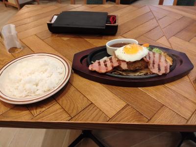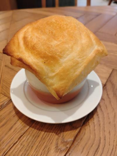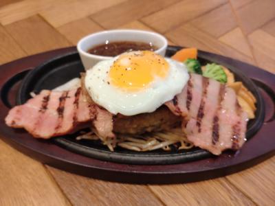 まず提供されたのは、バルーンスープ。パイに包まれていて熱々。お店に寄ればパイ生地は、提携工場と共同開発したスープに合うように生地や風味にこだわったものとのこと。コーンポタージュスープは、コーンの濃さのわかる味。一気にオーブンで焼き上げているので熱々で、パイをスープに浸しても風味は損なわれず、パイに濃厚なスープがしっかり絡んで美味。続いてメインのハンバーグ。注文を受けてからミンチを叩き、手ごねして形成、オープンで焼き上げたハンバーグは、鉄板で提供されるのでこちらも熱々。ナイフを入れると溢れ出す肉汁がすがさに驚く。そして柔らかさの中にも食べ応えがある。ソースは3種類からオススメのオニオンを選択。こちらのお店ではソースは付けて食べる。玉ねぎの旨味が出た甘めのソースで、これがハンバーグとめちゃくちゃ合う。厚切りベーコンも美味かったり最近食べたハンバーグの中ではトップをいく味。東京で食べられないのが残念ですが、九州に行ったら是非行きたい、オススメのお店です。- 旅行時期