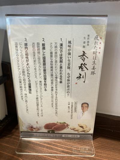 地下鉄銀座線末広町駅前からすぐ、蔵前橋通り沿いにある生姜豚専門店。「生姜豚」とは、昭和40年代はじめから湯島(東京都文京区)に居を構えた香取家(創業者)に伝わる料理で、国産の豚肉を通常の2~3倍の生姜とニンニクが効いたタレに長時間漬け込み、火を入れた料理。メニューは、この生姜豚を使った「生姜豚重定食」と「生姜豚カレー丼セット」の2つのみで、それぞれ並、大盛、特盛がある。平日のランチには、サラダがついたレディースセットもある。