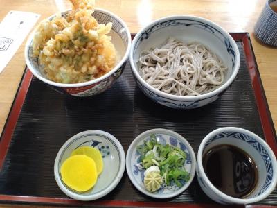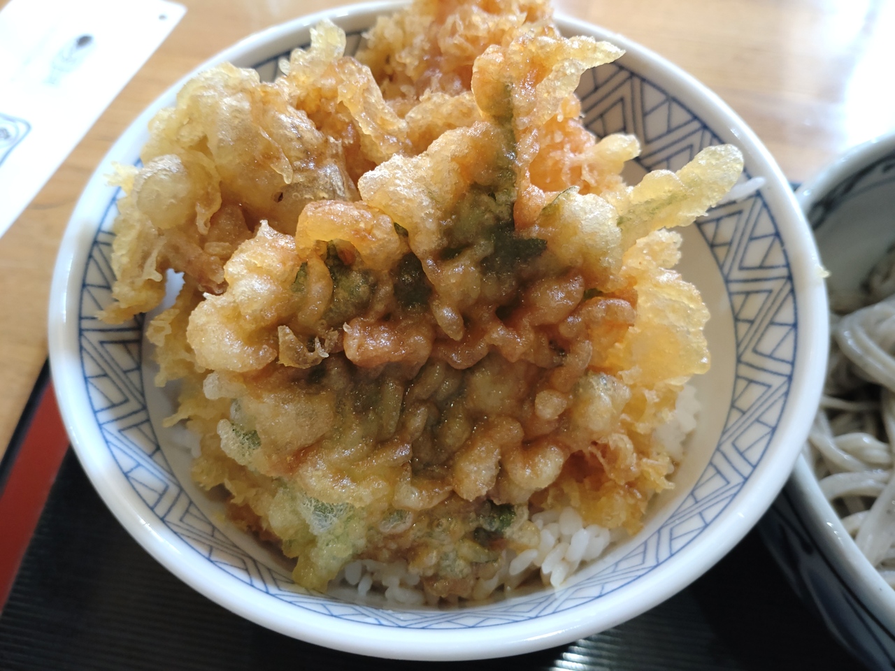 ランチに訪問しましたが、11時~22時までは通常メニューや丼ものとのセットメニューに加えて720円のサーピスメニューがあり、天丼、親子丼、野菜かき揚げ定食、もり丼(後述)(いずれもそば付)はお得感がある。周りを見渡すと、半数以上の方が天丼セットを頼んでいるよう。そこで自分も「天丼セット」をオーダー。