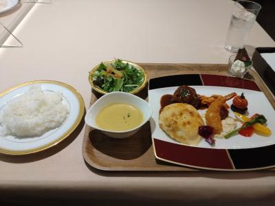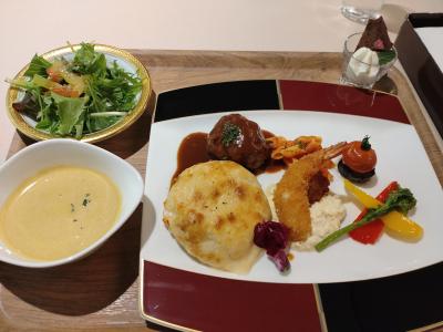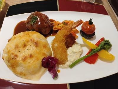 創業以来変わらない味の「国際会館伝統のビーフカレーライス」にも惹かれましたが、ハンバーグ、エビフライ、グラタンに、サラダ、コーンポタージュスープ、ライスorパン、プチデザートがついて1100円の火曜日の日替りランチ(洋食プレート)をオーダー。ハンバーグは肉汁も適度にあり美味。エビフライはエビがプリプリしている、何よりもタルタルソースが美味。グラタンは少し重たかったかも。でもどれも美味。