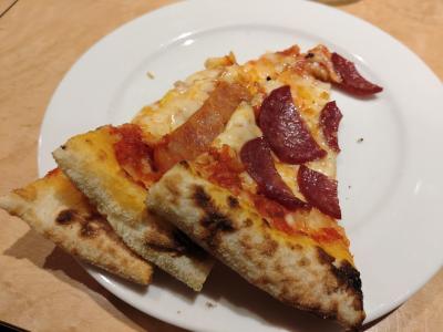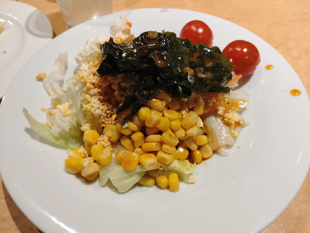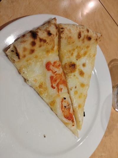 しかし、メニューはイタリアン。パスタとサラダバー、ドリンクバー付で、180円でピッツァ食べ放題プラスができるランチが夜も食べられるのは嬉しい。今回は「魚介類のトマトクリーム」のパスタセットで、ピザ食べ放題付きにしました。サラダを取りに行くか行かないか、くらいで、ピザがやってくる。毎回毎回違うピザがやってくるので、気が抜けない。ピザは大きくなく、生地も薄いタイプで、店内の釜で焼いたもの。クオリティも高いので、ついついたくさん食べてしまう。サラダもドレッシングが6種類もあってどれも本格的なもの。メインの魚介類のトマトクリームパスタは、ホタテ、海老、イカなどの魚介類の旨味とトマトクリームのコラボで濃厚な味。酸味もありますが、クリームが良い働きをしていて、決して嫌なものではない。もちろん生パスタなのでもちもちしていて美味。