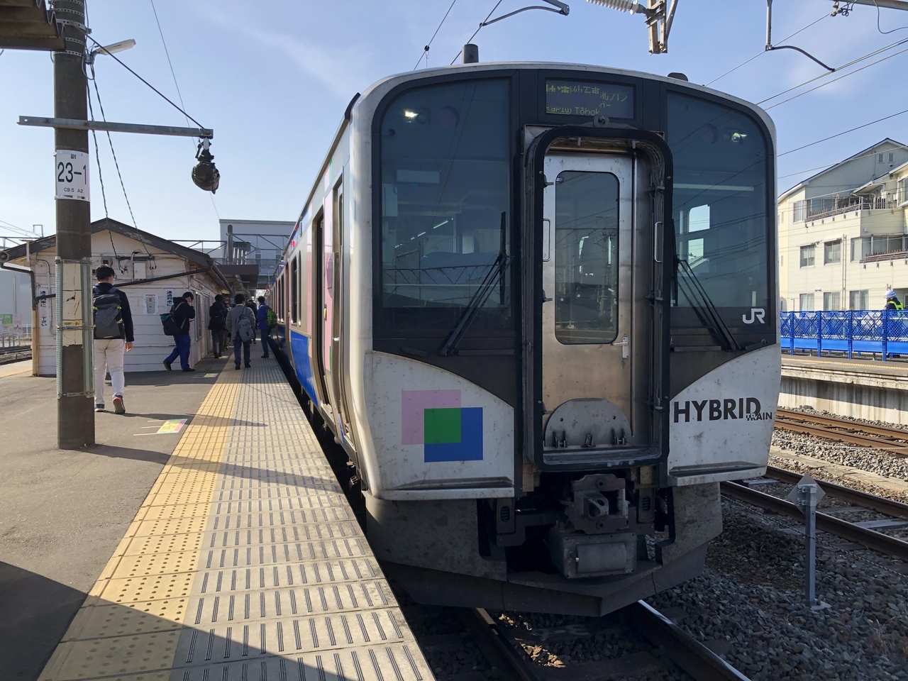 車両は、交流電化の東北本線、直流電化の仙石線両方が走れるように、当時最新鋭のハイブリッドディーゼル車両のHB-E210系気動車が用いられており、車両のデザインは仙石線のラインカラーである青と、東北本線のラインカラーであるみどりを基調に、扉付近には地域の桜の名所をイメージした桜色を用いられています。また、ボックスシートで、トイレ付き。