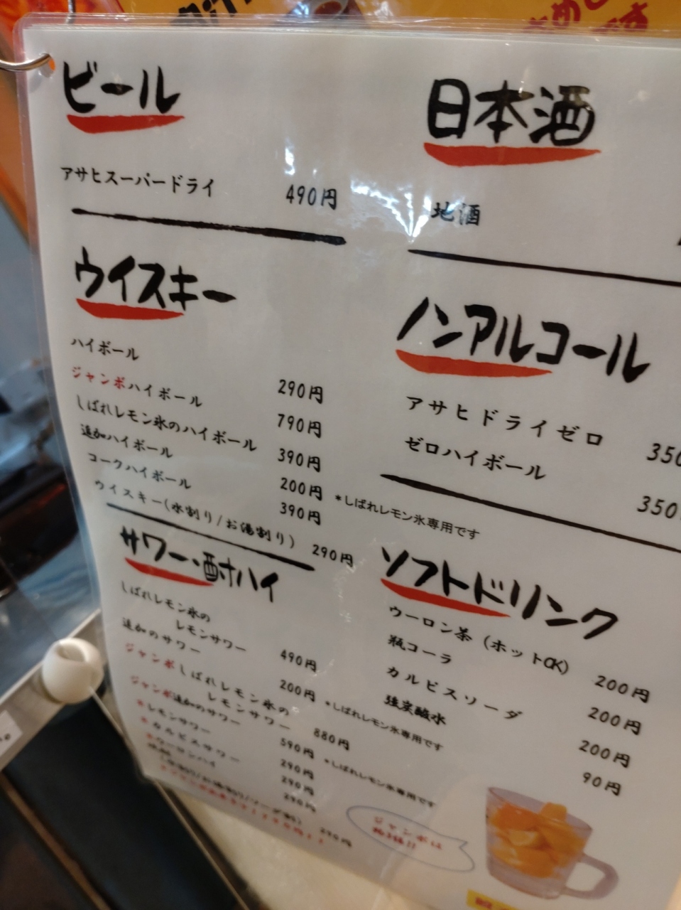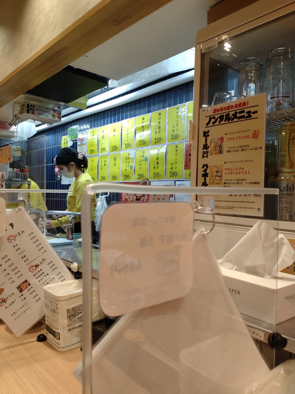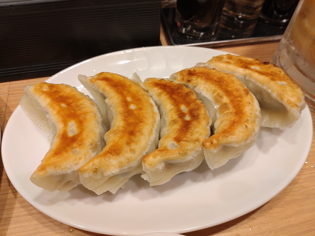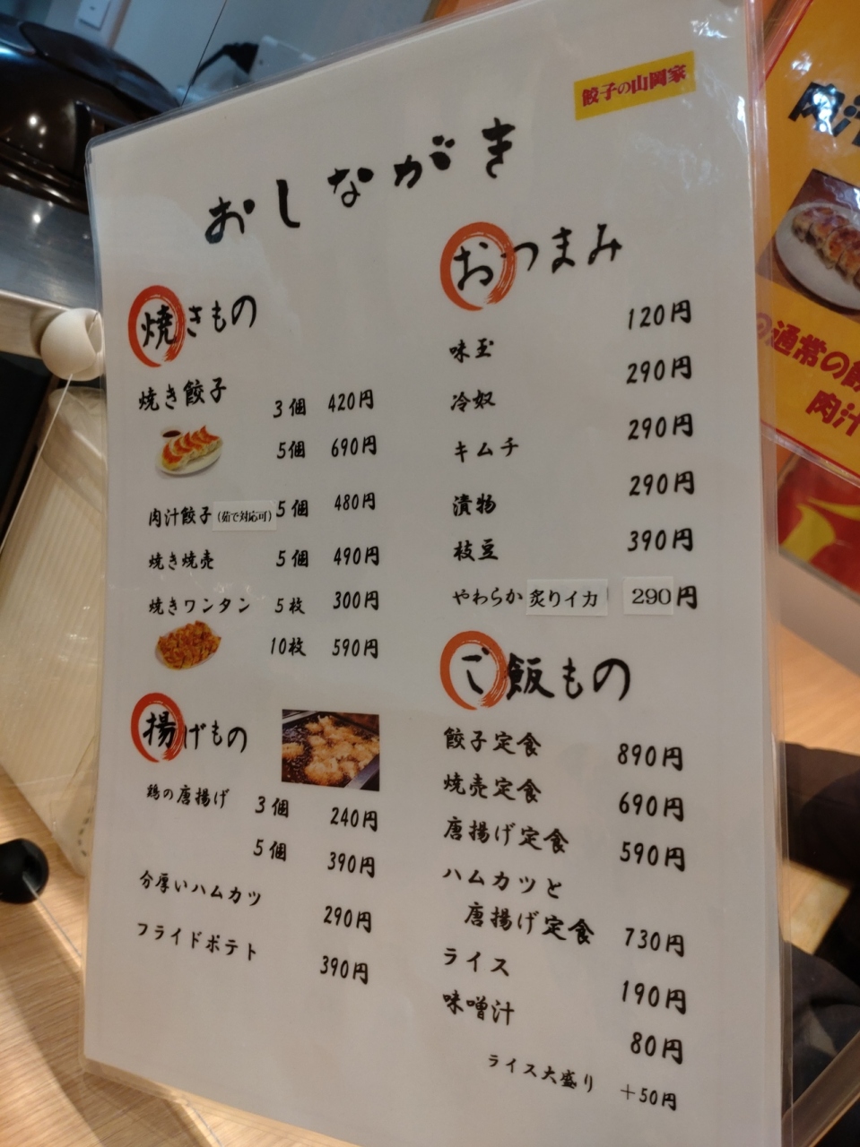 メニューは、餃子の種類が多いわけではなく、焼き餃子と肉汁餃子のみ。肉汁餃子は茹で餃子もできます。餃子以外のメニューもそこそこあって、唐揚げ(ザンギとは言わない)やハムカツ、冷奴、キムチなどが290円~で並びます。プラス200円でご飯、汁物、漬物がつき、定食にできます。なお、調理の関係なのか、炒めものはありません。