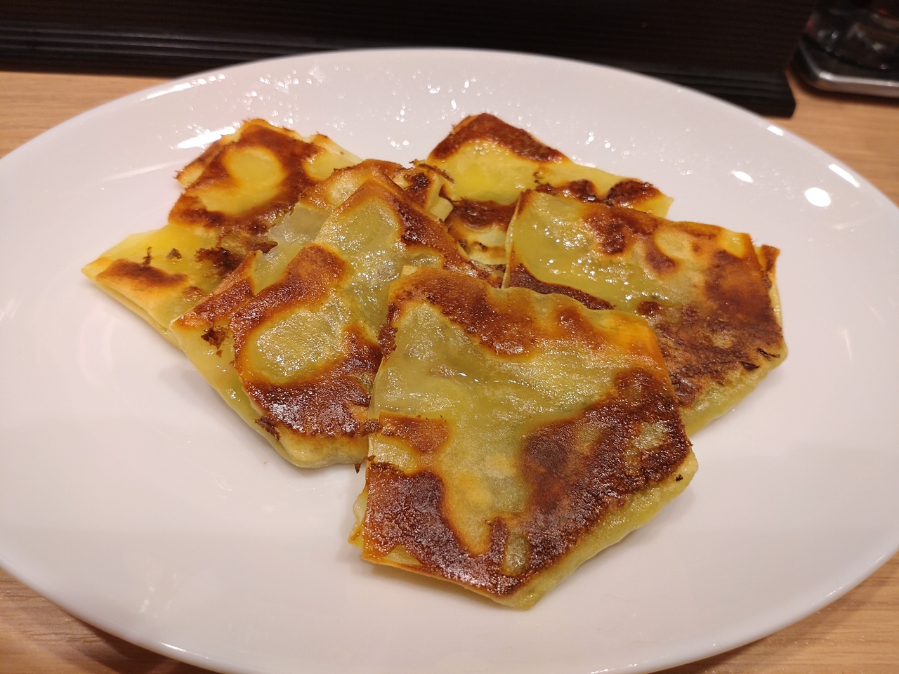 軽く食べられる。餡が大きく、皮はもちもちしていているのでは美味。あまり匂わないにんにくを使っているようで、匂いは控えめ。すぐ出るオーダーとして頼んだ焼きワンタンは、パリパリしていて、お酒のつまみにあいます。お酒も種類は多くありませんが、3倍の量のあるジャンボサワーや、追加のサワーなども用意されているのは良いです。全体としてコスパは良い。