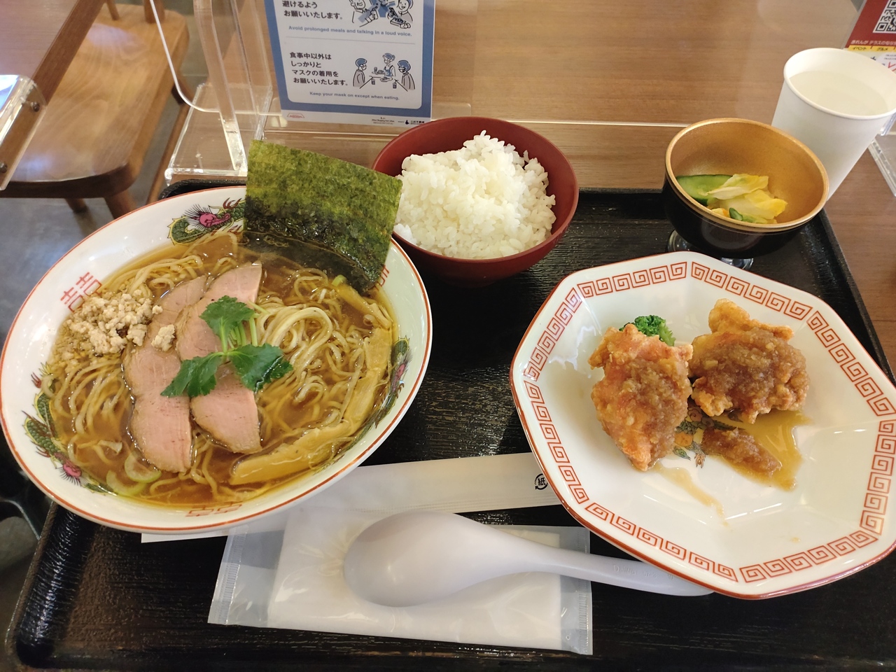 赤レンガテラス3階のフードコートにあるラーメン店。西8丁目にある「in EZO」というラーメン店の系列店で、各地で開催されるラーメンショーでも賞を獲っているようですが、あまり聞かないお店と思いつつも、コロナ禍での閉店時間も迫っていたので、日替りで一品料理が唐揚げだったので「特ゑぞ定食」をオーダー。今回の一品料理は、おろし唐揚げでした。