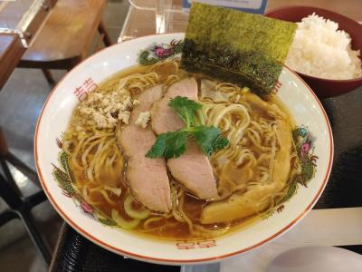 ラーメンは、醤油、塩、じゃが白湯、まぜそばから選択。イチオシという醤油をオーダー。色の濃いスープで昔ながらの醤油ラーメンのイメージ。麺は中太で少し硬めの茹で方。叉焼は厚みが少しあり、メンマは穂先で、挽肉と三つ葉がトッピングされていました。スープが濃いので白飯があって良かった。唐揚げは「ザンギ」と呼ばないところが良い。柔らかくて、おろしソースと合っていて美味でした。- 旅行時期