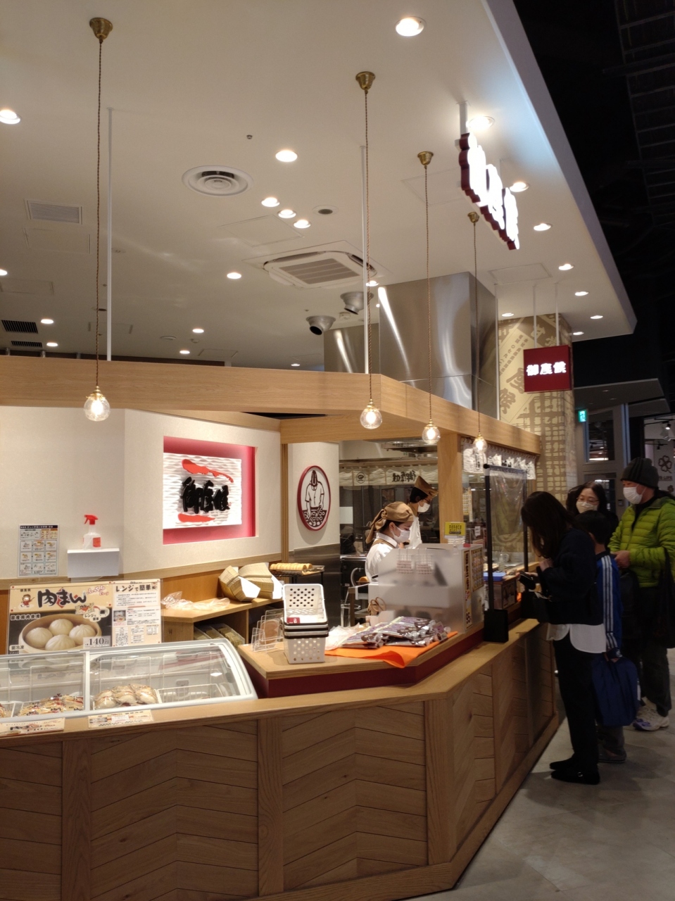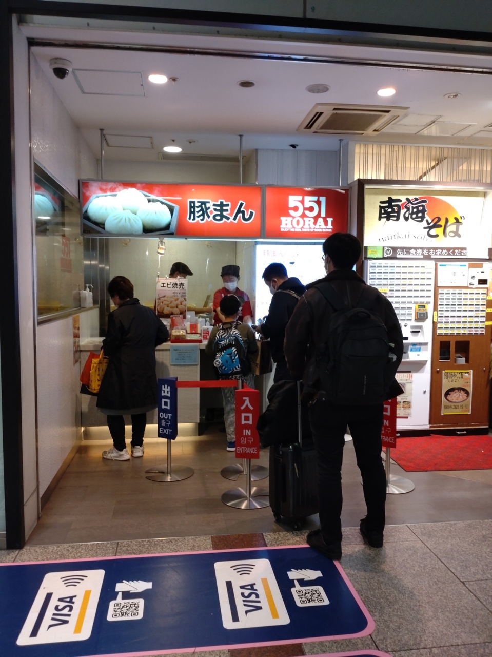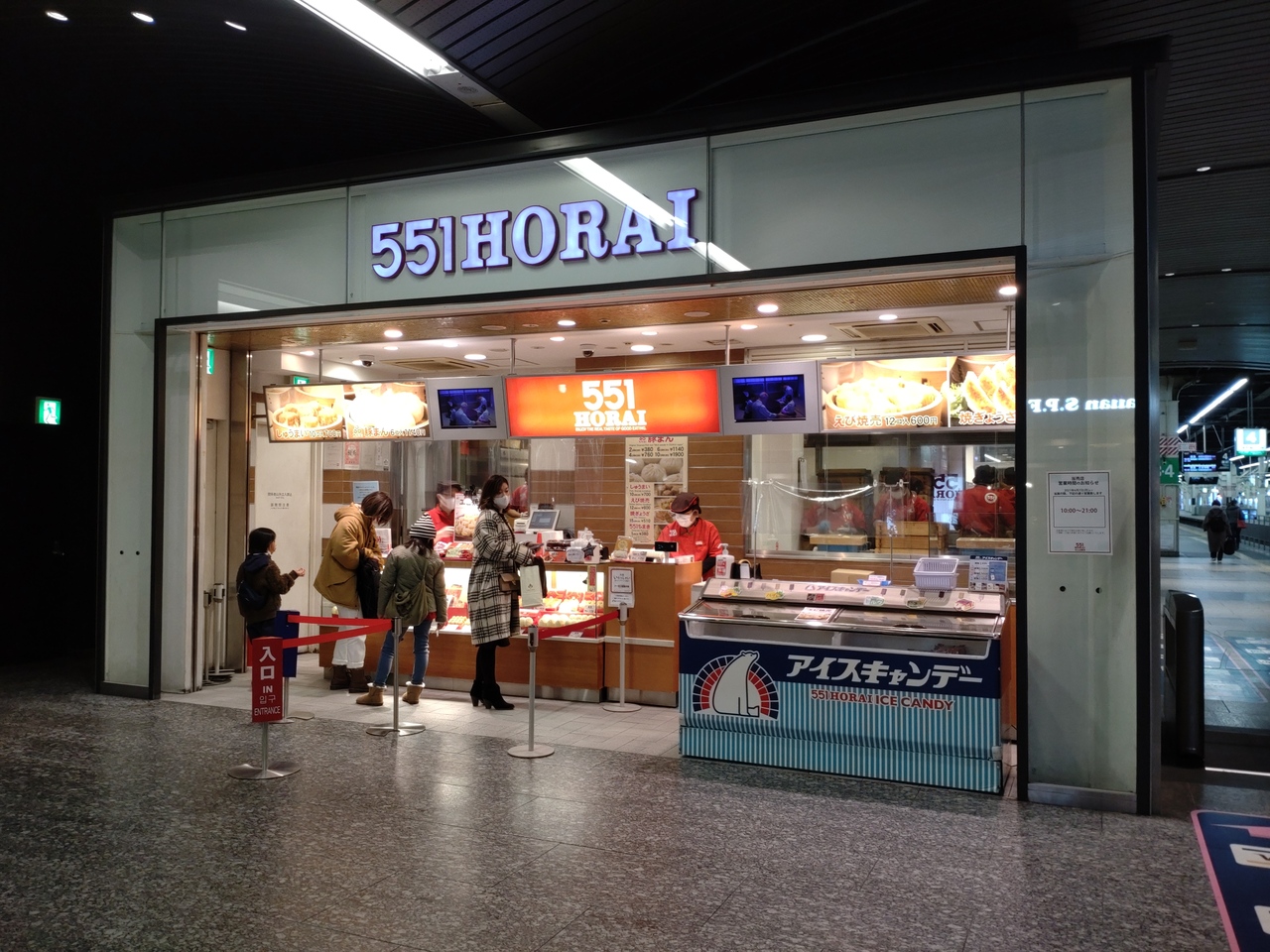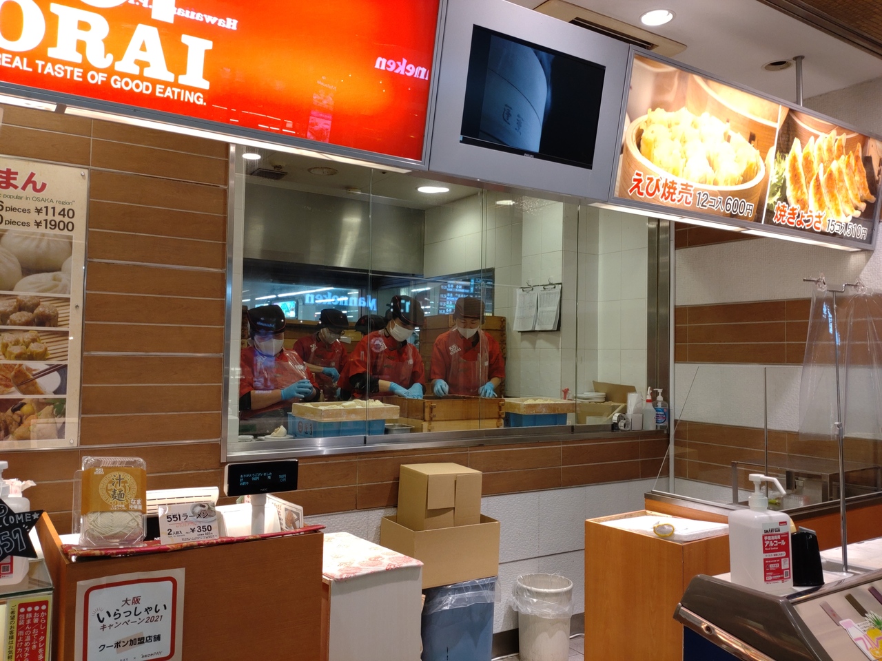 南海なんば駅3階北改札口左側(高島屋横)にある551蓬莱。改札口を入ってからも売り場(3番線ホーム先、南海そば隣)があり、列車に乗る前は、改札内のほうが空いていることが多い。関西しかお店を出さないという方針を守ることから関西のお土産の定番。全国の催事では大人気のお店。関空経由で出かける際、こちらで買っていくことも多い。他店同様、お店で作っている出来立てを購入できるのもありがたい。肉だんごも販売。なお、駅のお店がらも阪急梅田駅とは異なり現金のみ。