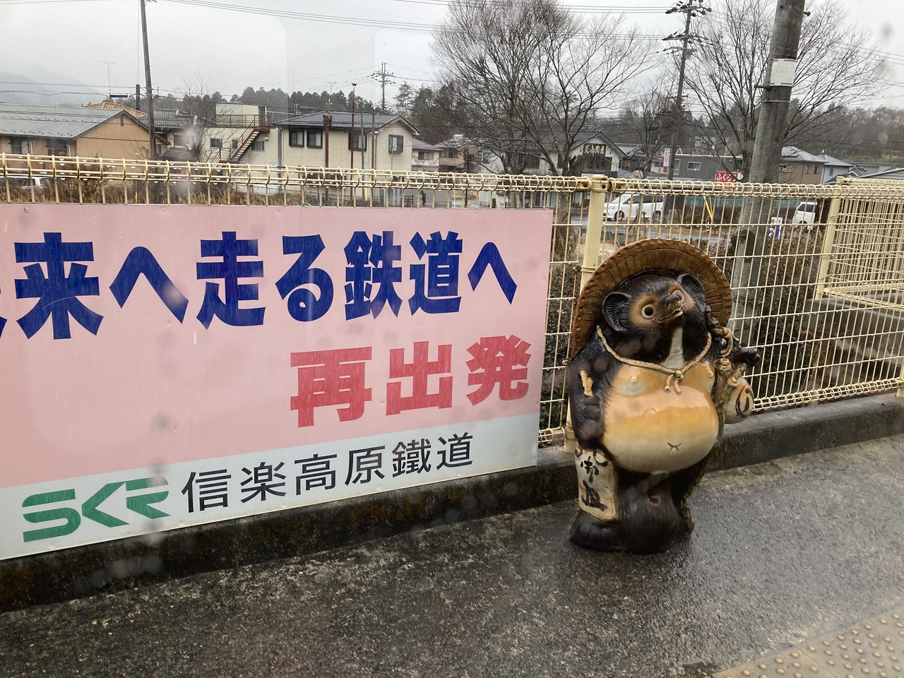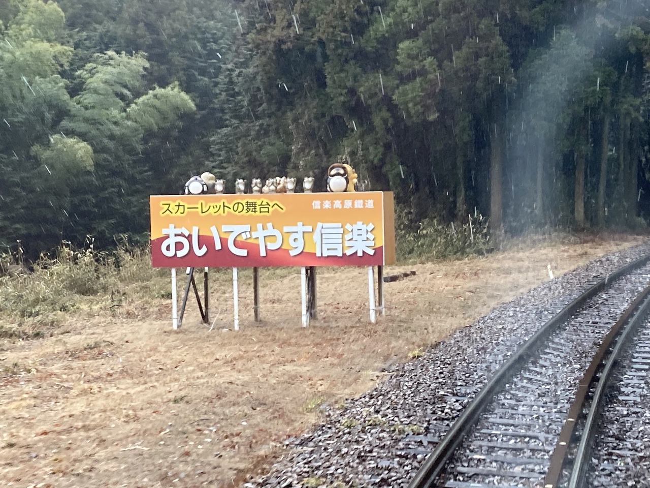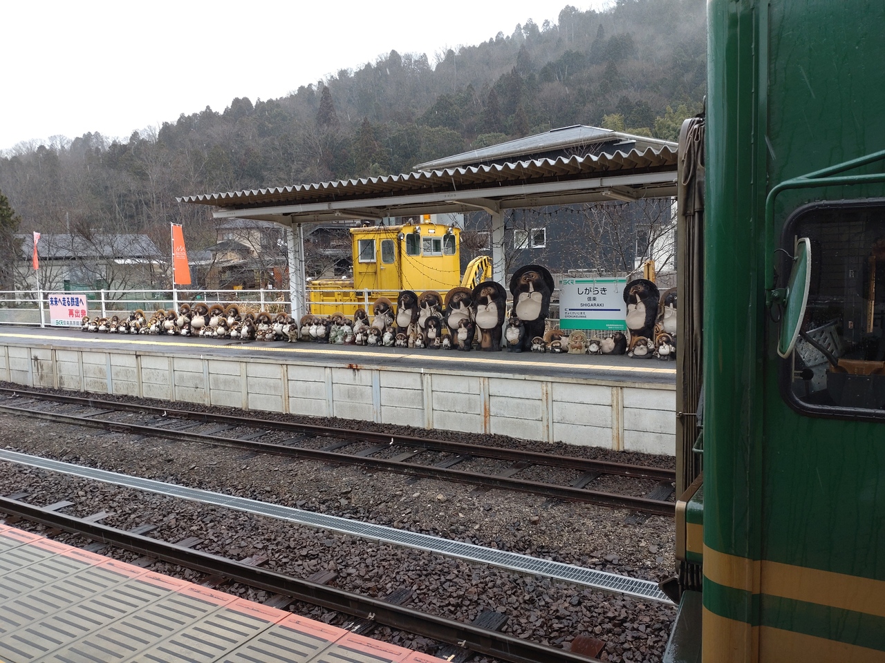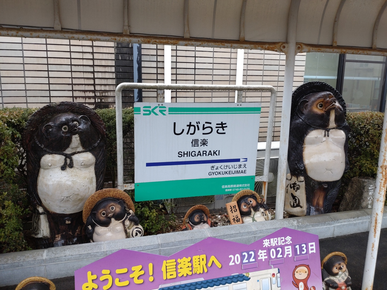 始発駅となる貴生川駅は、JRのホームの奥にある3番ホームから出発。信楽高原鐵道の駅員はおらず、JRを出ずに乗り換え可能。IC乗車券の読取装置が置かれています。列車は、貴生川駅を出ると大きくカーブし草津線と分かれ、杣川を渡り田園地帯を通過すると、高低差が170mある33/1000の急勾配をゆっくりと走ります。車窓からは四季折々の草花が見られるほか、事故御座候廃止された小谷野信号場を通り、1991年5月に死者42人、負傷者614人を出した信楽高原鐵道衝突事故の慰霊碑の前を走ります。このあたりは民家がほとんどなく、駅がない理由もわかります。次の駅の紫香楽宮跡駅までの間が9.6キロもあり、全線の半分以上がこの勾配区間が占めています。奈良時代に聖武天皇が営んだ紫香楽宮の関連遺跡あと近くの紫香楽宮跡駅を出ると600mで信楽線開業当時からの木造駅舎を使用する雲井駅。さらに2.2kmで勅旨駅、1.0で玉桂寺前、1.3kmで終点、信楽駅に到着します。日本六古窯の一つである信楽焼の町である信楽駅は、高さ5mの大きなたぬきの焼物がある他、各駅には信楽焼のたぬきが飾られています。