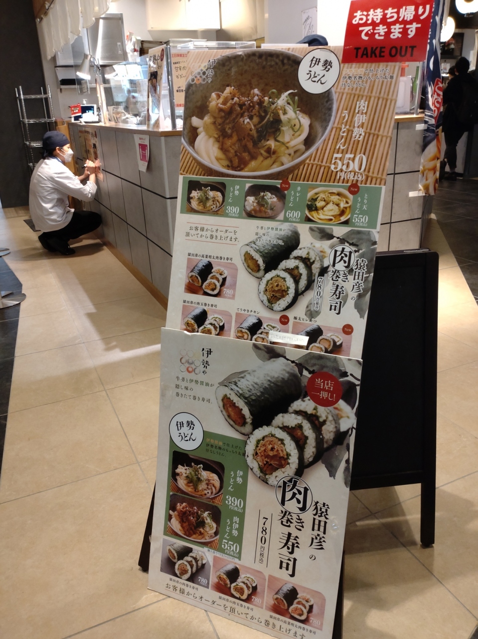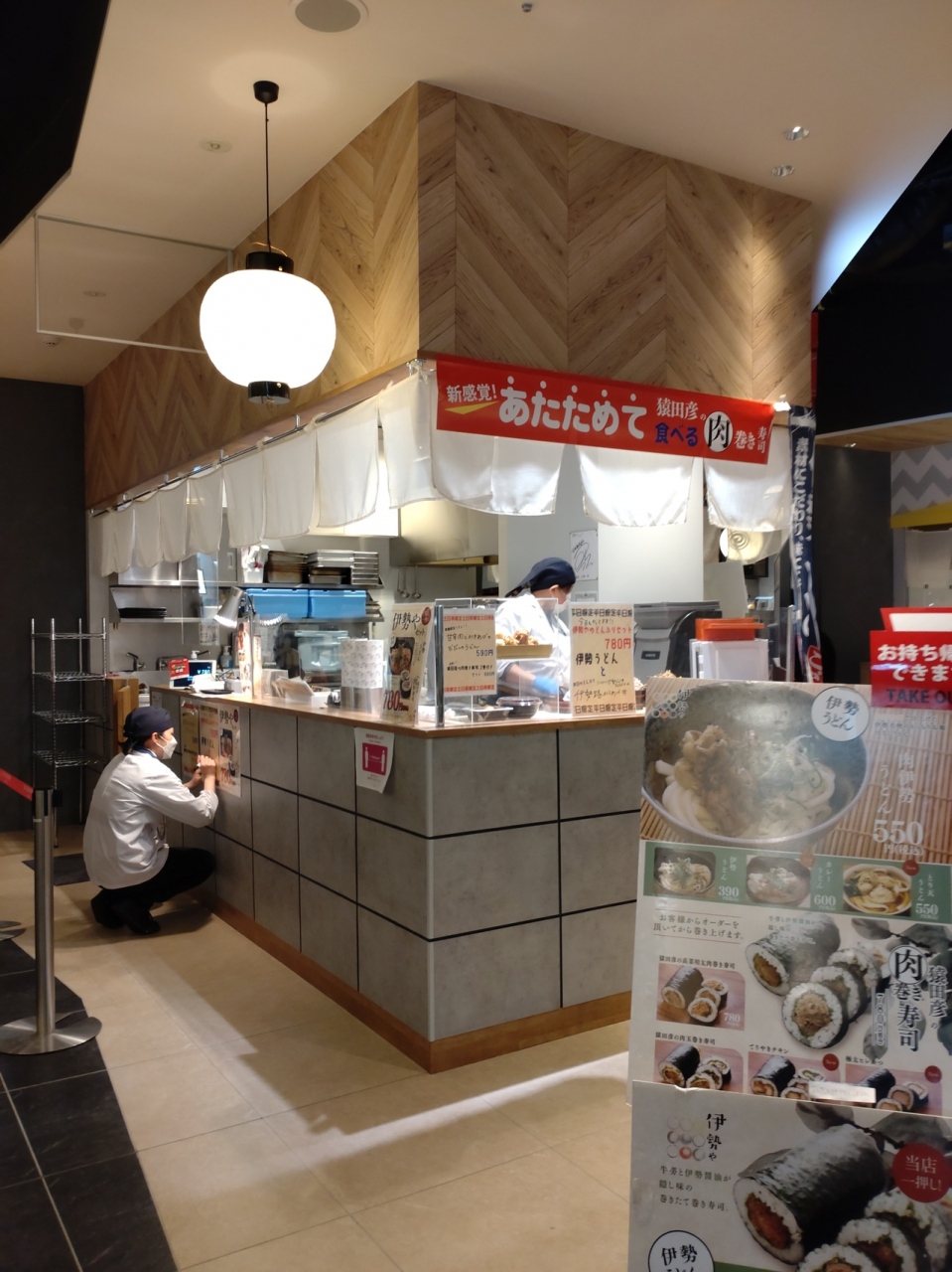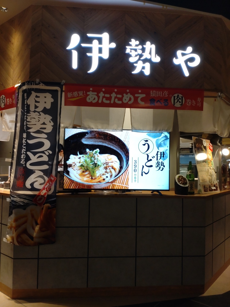 2021年11月に大阪府松原市にオープンした「セブンパーク天美」1階のニューまったら横丁にある伊勢肉うどんと肉巻き寿司のお店。「伊勢や」は、2021年2月に大阪府堺市の南海高野線・JR阪和線三国ヶ丘駅2階の南海線改札口近くにオープン以来、南海本線堺東駅構内、近鉄大阪難波駅構内に出店しており、こちらは4店目の出店。2月のMBSテレビ「水野真紀の魔法のレストラン」で紹介されていた「肉巻き寿司」を食べてみたくて訪問。オーダーしてから作り始めるので5分くらいで提供、今回は持ち帰りにしました。