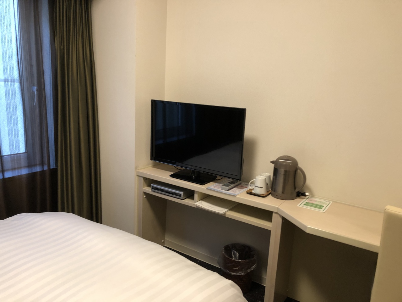 今回は南館のスタンダードシングルルームに宿泊。肝心の客室は、ビジネスホテルよりは広めの15㎡ですが、そう広いという感じではないです。しかし、白と黒、ブラウンで統一されたモダンな感じの部屋で、高級感もあり、また作業ができる机と椅子を完備しているところはなかなか。南館のベッドはシモンズ製(北館はサータ製とのこと)で、硬さはちょうど良かったです。窓が小さいのでやや暗めでしたが、私が泊まった部屋からは九州新幹線も在来線も見ることができました。一方、駅沿いではあるものの、騒音を感じることは全く無く、快適でした。