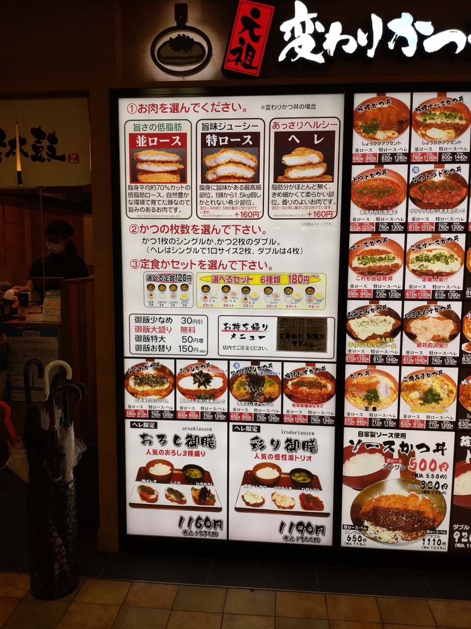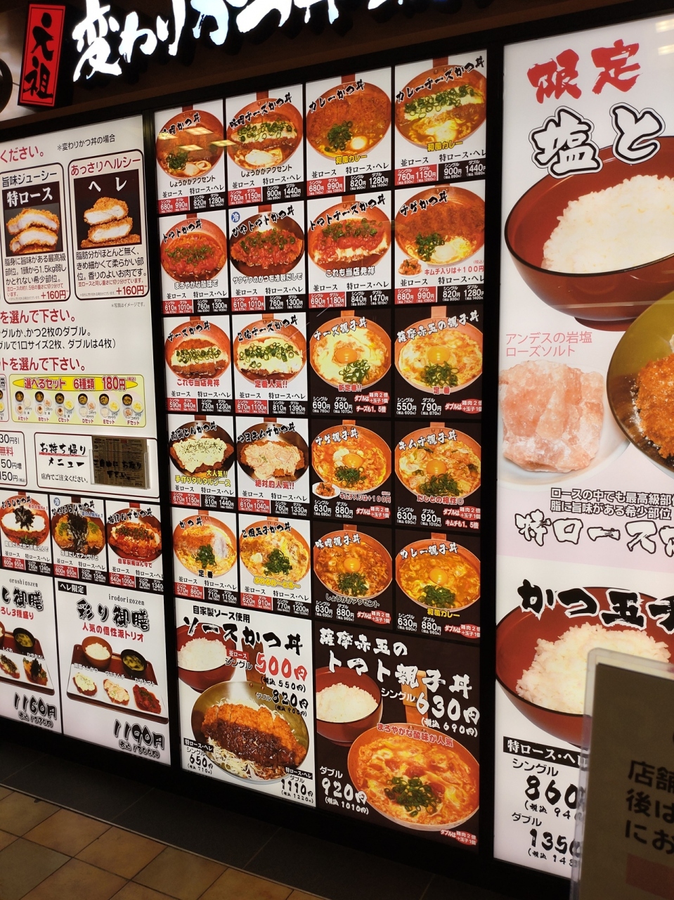 こちらの特徴は、「変わりかつ丼」のメニューの豊富さと、カツ丼ながらも綴じたカツ丼が別皿で提供されること。「変わりカツ丼」は、卵とじのいわゆるかつ丼から、ソースかつ丼、おろしかつ丼(こちらが発祥とのこと)などポピュラーなものから、トマトかつ丼、チーズかつ丼、塩とんかつ丼、キムチかつ丼をはじめ、期間限定メニューを除いても18種類もある。指定農場で、穀物飼料で育てられた原種豚の生ロース肉を使ったカツと、カツオやサバを使った手作りの天然だし、国産野菜、国産米、キャノーラ油、生パン粉を使ったカツは、あっさりヘルシーの「並ロース」と、旨味の多い「特ロース」がおり、特ロースはプラス150円。かつも1枚のシングルか2枚のダブルから選択。定食にするか空だや惣菜から2つ選べるセットから選べる。