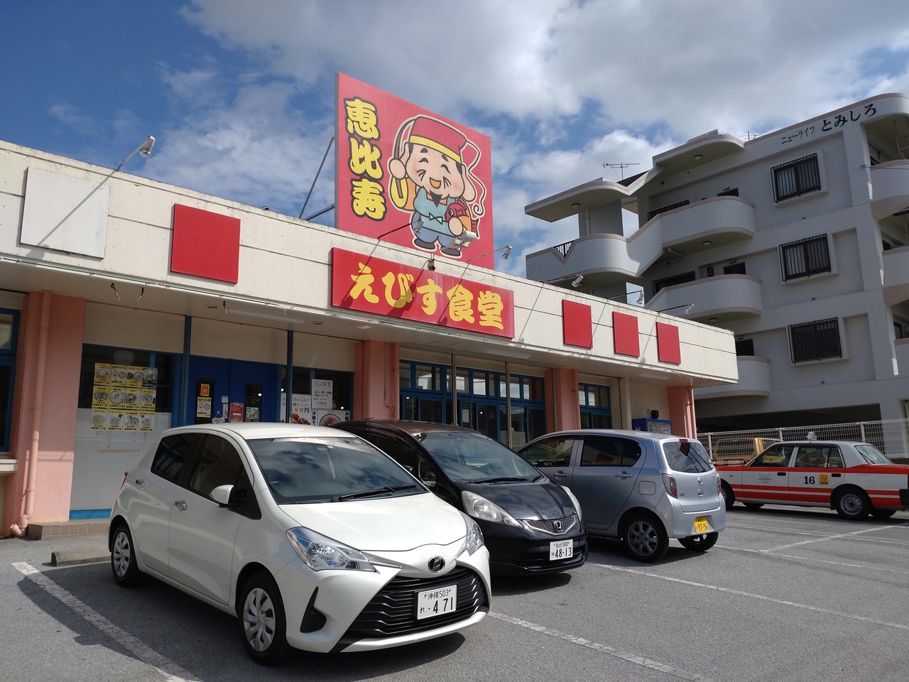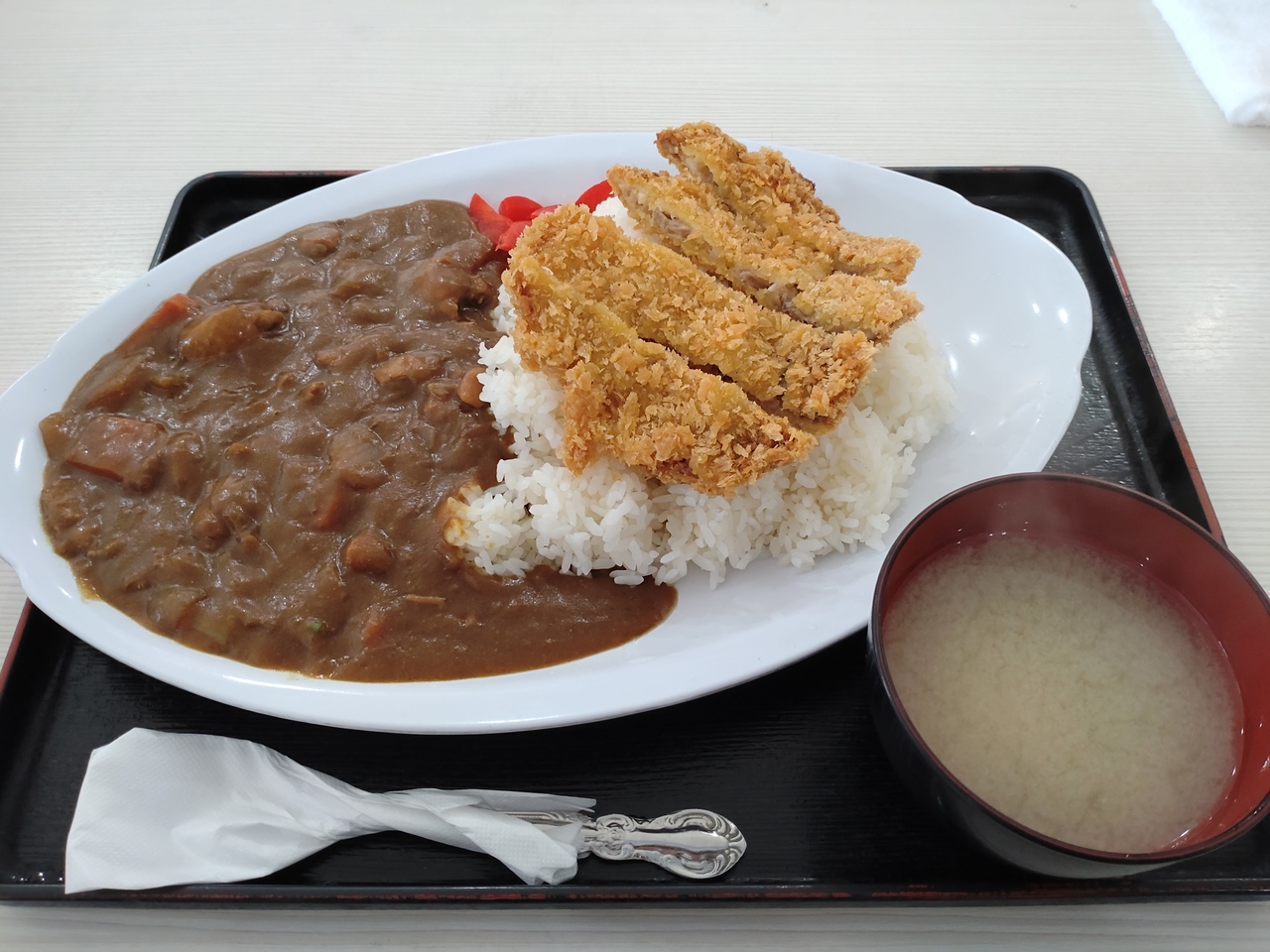 奥武山公園や小禄病院から県道7号線(バイパス)を糸満方向に南下した豊見城市の旧海軍豪跡近くにある大衆食堂。ド派手な看板ですぐにわかります。テーブル席、カウンター席、さらには座敷席もある、一人でも家族でも楽しめるお店。町の食堂といった雰囲気で、メニューもかなり豊富。毎週金曜日に沖縄テレビで放送されている「アゲアゲめし」で紹介されたチャンプルーにするか、それとも定番のとんかつカレーか、それとも大きなオムライス、カツ丼、目玉焼きの乗ったチキンカツちゃーはんか。。。悩んでしまうメニューの多さ。オススメはそばカレーセットだそう。結局、食券機でカツカレーを購入。セルフのお水を準備しながら待つこと5分くらいで到着したとんかつカレーは、量は沖縄にしては少し少な目(沖縄以外では多い)の普通盛り。カレーのルーは少し薄めのあまり辛くないもの。とんかつは思った以上にサクサクしていました。やや期待が大きかったのかもしれませんが、もう少し特徴があるといいかも。ただ、ランチ時は結構混雑しています。