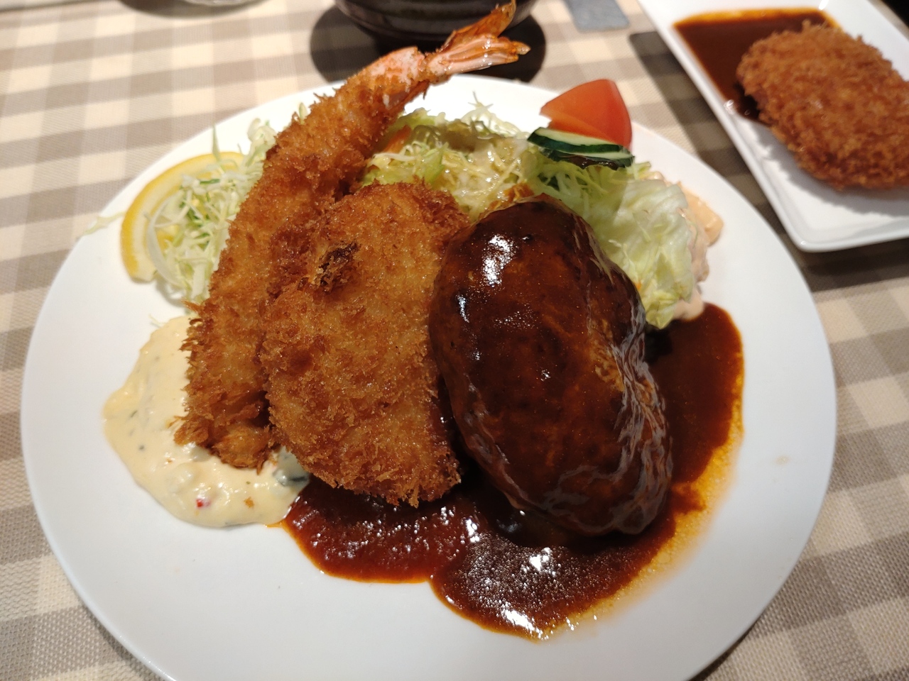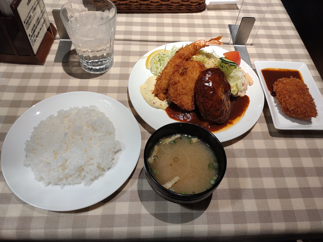 とはいえ、やはり食べたいのはグリルロンが堪能できるハンバーグやカニクリームであることは変わりなく、今回のオーダーは、ハンバーグ、カニクリームコロッケ、エビフライののった不動の人気セットメニュー「Cセット」。これにトッピングでヘレカツを加えるのが自分流。まず、カニクリームコロッケは、これぞ洋食屋の味。油切れの良いサクサクな衣と濃厚なクリームによるコロッケで、トロッとしないところがまた良い。エビフライは、プリプリなことは言うまでもない。身の詰まったもので、タルタルソースの酸味がたまりません。王道のハンバーグは、ふっくらとした食感、お肉ぎっしりて、肉本来の旨味が楽しめる。ヘレカツは、お肉の厚さ、揚がり具合言うことないです。これをまとめるのが、デミグラスソース。もちろん手作りの濃厚なデミグラスソースは、すべての素材を洋食に変える魔法のソースでもあり、ライスにもピッタリ。さらに、オーロラソースで和えたマカロニサラダと特製ドレッシングのキャベツ、具がいっぱいの味噌汁と、王道を行く日本の洋食屋と言えます。- 旅行時期