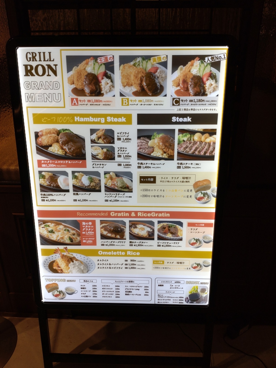 阪神百貨店梅田本店地下2階にオープンした阪神バル横丁のグルメゾーンにある洋食店。「グリルロン」といえば、1970年に創業したカフェから洋食店となり、現在では大阪市内に複数のブランドの洋食店を持つ会社の経営するお店。これまでは阪急三番街地下2階にのみお店があり、いつも混雑していましたが、待望の新店舗。昔ながらの洋食店という雰囲気はそのまま、かつ阪急三番街のお店よりも通路が広いのもよい。メニューは王道のハンバーグやカニクリームコロッケに加えて、ドリアやグラタンなど阪急三番街のお店にはないものがある。