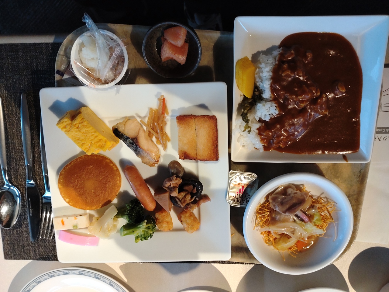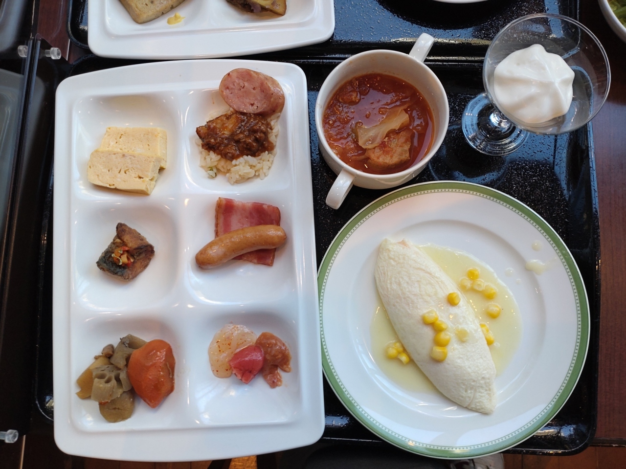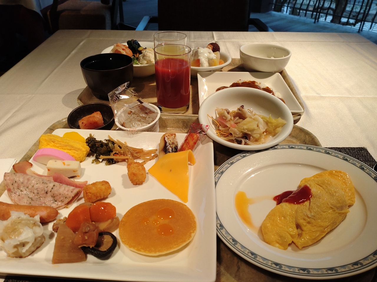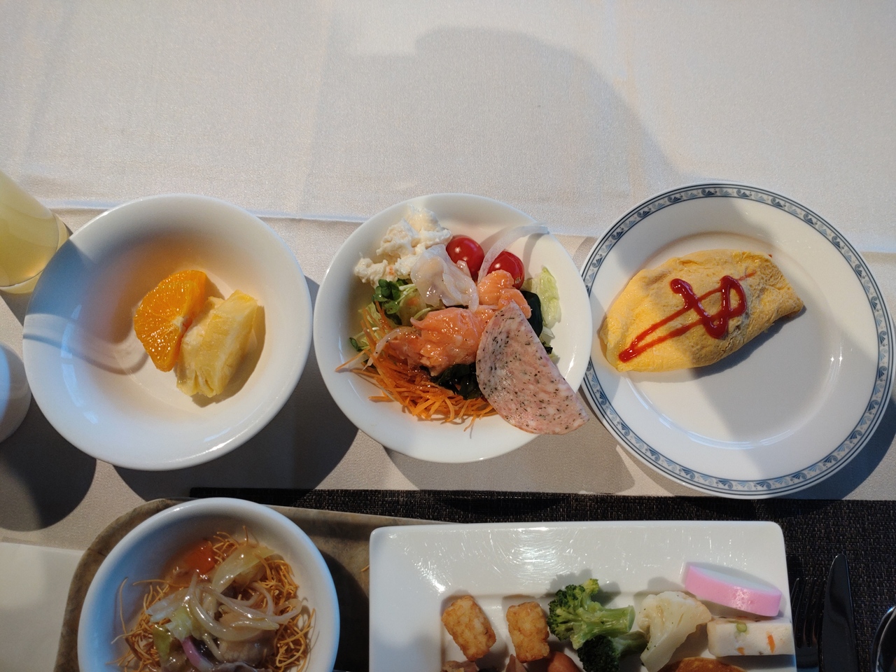 料理はスモークサーモンやハム、ベーコン、ソーセージパンといった一般的なものから、焼売やワッフル、更には長崎名物の皿うどんやハトシ、長崎蒲鉾などの郷土料理もしっかり。カレーもレベルが高く、目の前で作ってくれるオムレツも美味でした。- 旅行時期