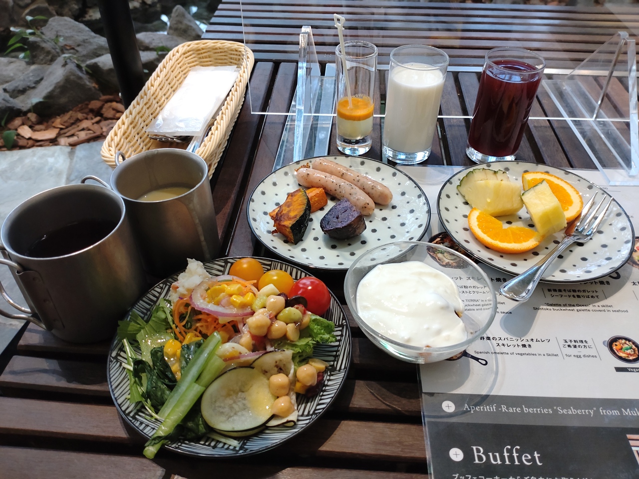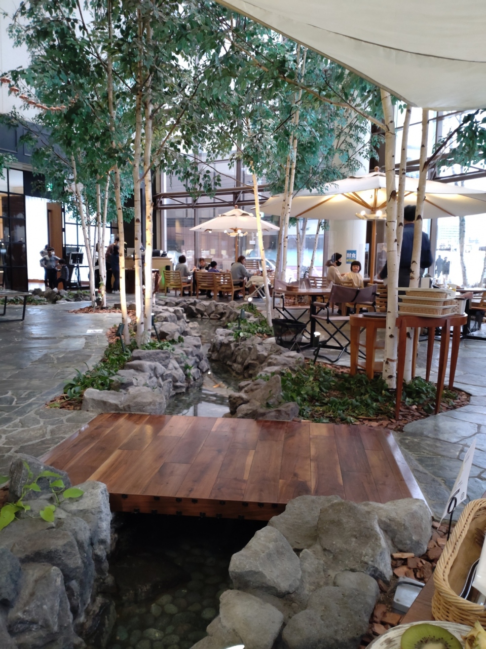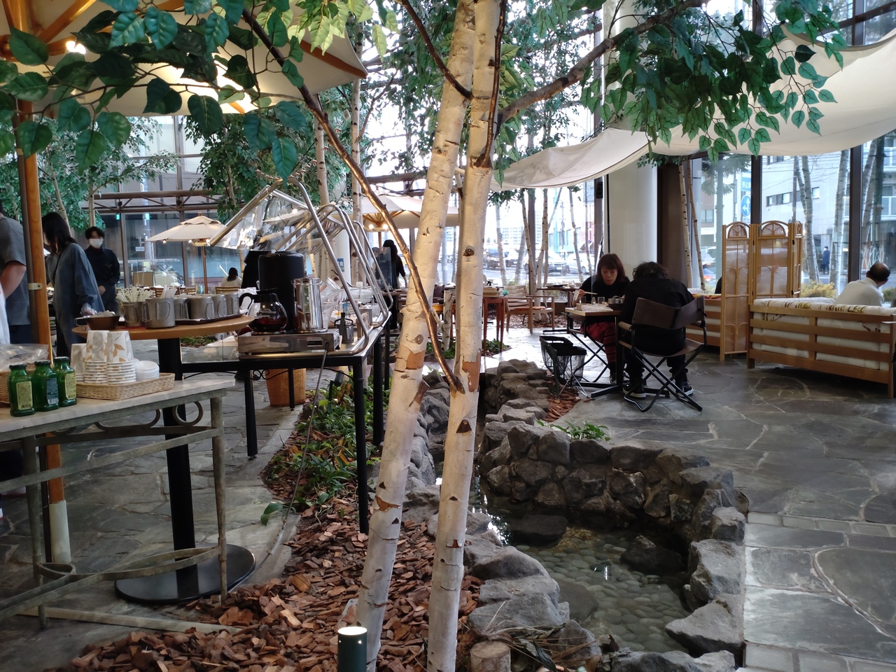地下鉄南北線中島公園駅から徒歩すぐのところにあるホテルマイステイズプレミア札幌パークの1階にあるレストラン。当ホテルで洋食の朝食を選択した場合は、こちらが会場になります。全面ガラス張りの店内は開放感かあり、店内には木々や小川が流れ野外を思わせるタープテントが張られています。椅子や机はキャンプ用品、コーヒーや紅茶のカップにはステンレス素材のものが用いられており、アウトドア感が演出されていたりもします。