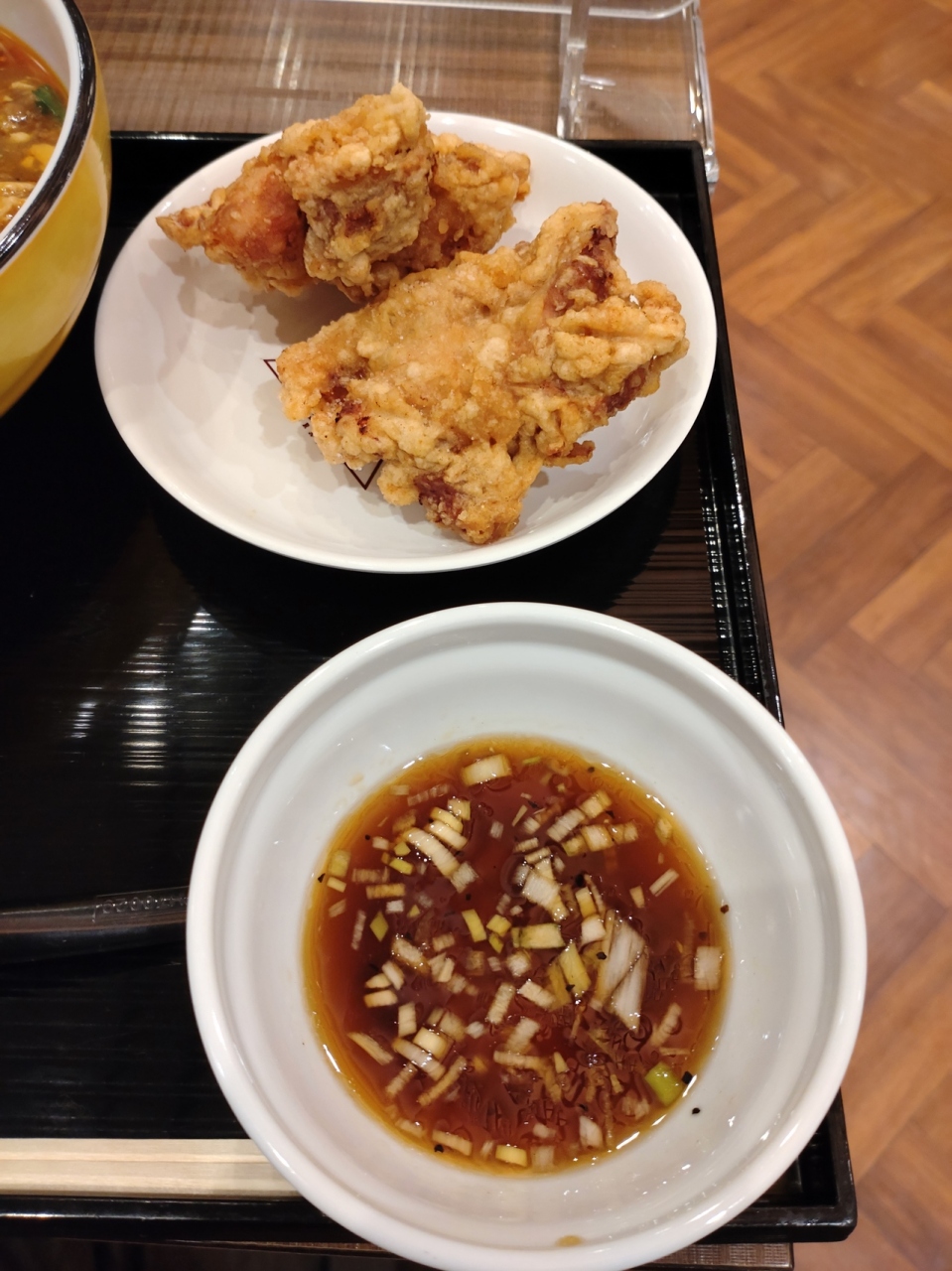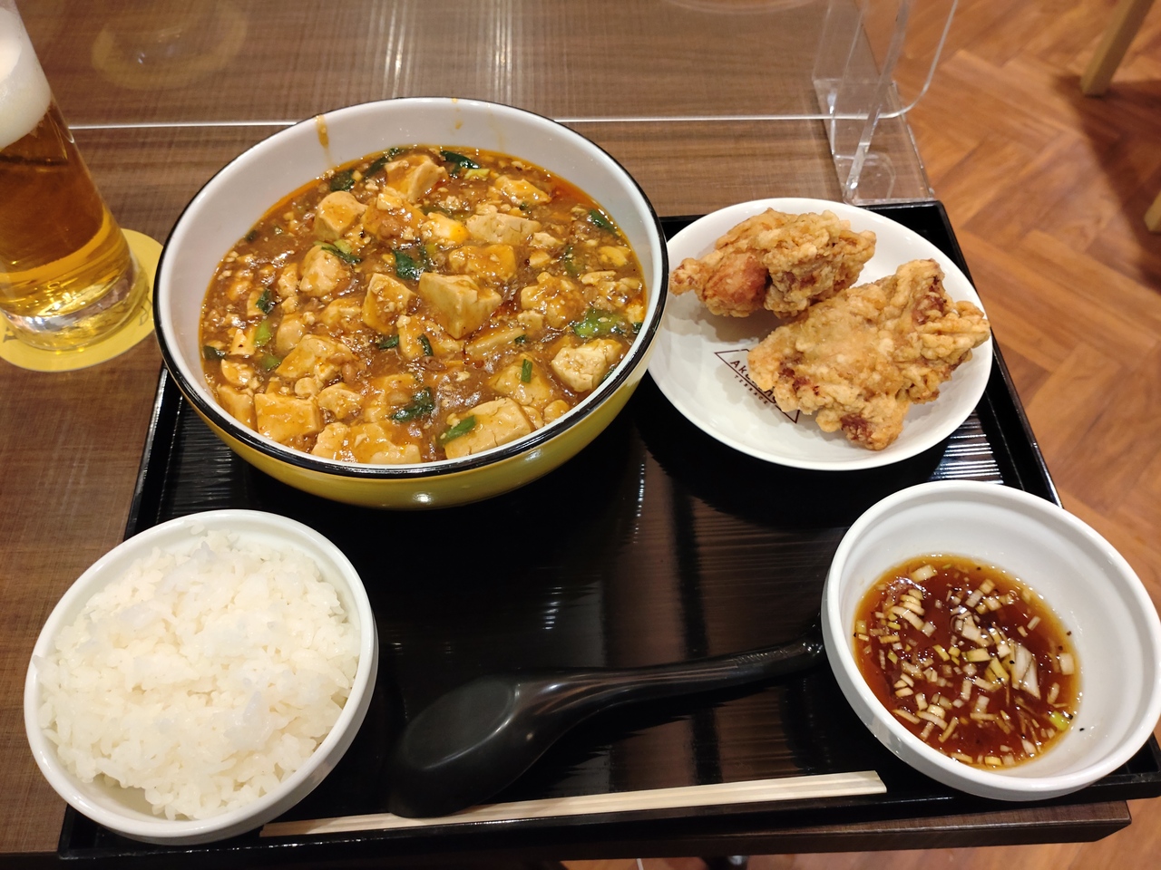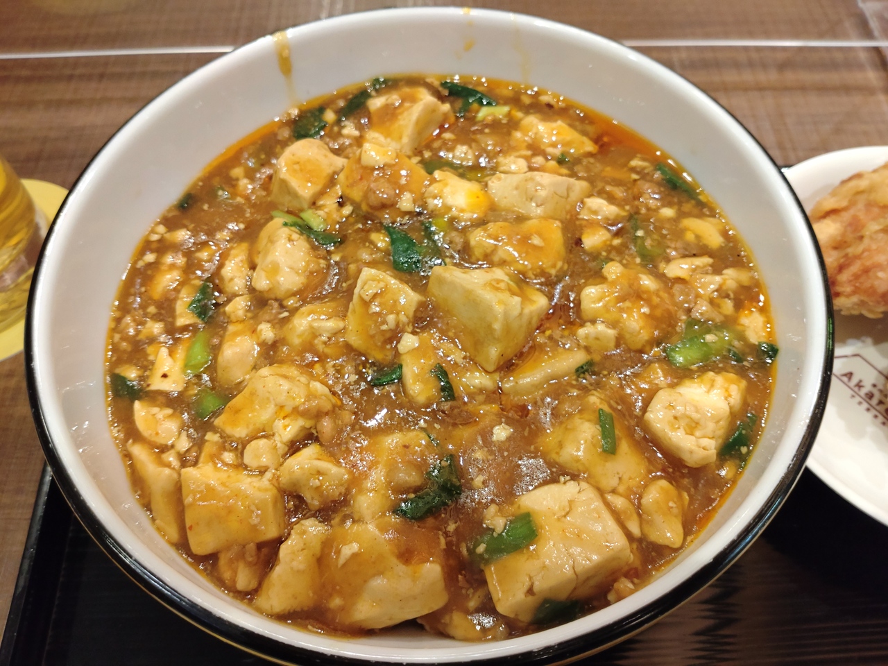 今回はマーボー麺とザンギ(2個)がセットになった「最強SET」をオーダー。待つこと数分、本店ではありえないセルフ方式ですが、見た感じは本店のマーボー麺と変わらず、麻婆豆腐そのもの。箸を入れると面談が出てくる。スープそのものが麻婆豆腐そのものでとろみがあって美味。辛さはあとからやってくる。毛穴から汗をカキカキ食べていく。麺は細めのやや縮れ面談で、柔らかさがありますが、麻婆豆腐との相性は最高。一方、ザンギはやや冷えていてジューシさが少し足りない気がしましたが、大きさには圧倒されます。酸味のある特製タレは本店と変わらず美味。