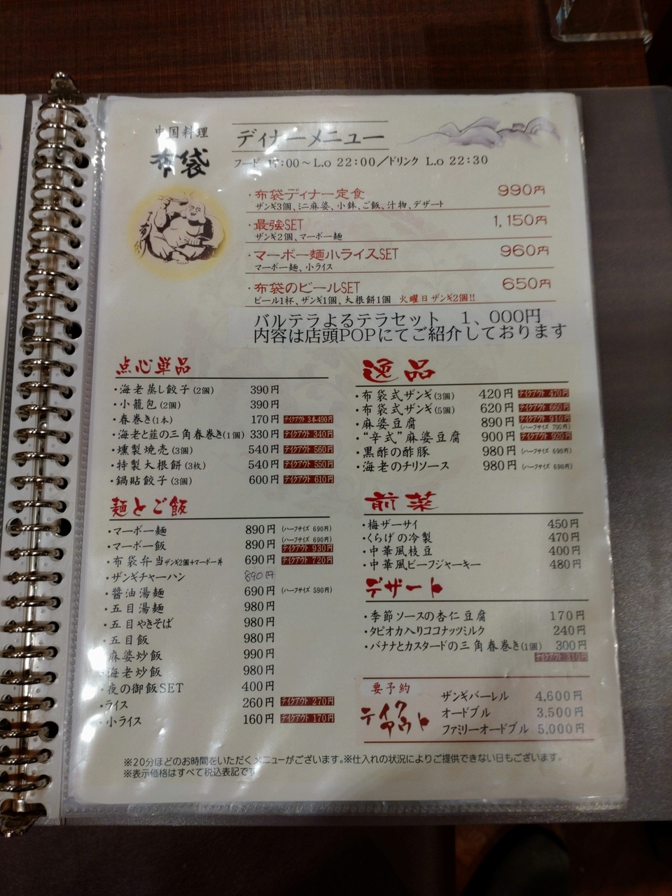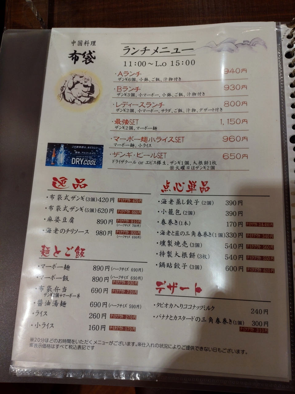 JR札幌駅から徒歩5分くらい、チカホ直結の赤レンガテラス3階のフードコートにある中華料理店。布袋と言えば、西9丁目の市電通りに本店を構えるザンギとマーボー麺が有名なお店。本店は、真冬出行列ができる昭和ムードむんむんのお店。しかし、こちらは三井ショッピングパークが経営するビルのフードコート。店構えに昭和のイメージはありますが、かなり近代的で、先払い方式です。本店と比べてかなり絞られていますが、大きさに圧倒される名物のザンギともう一つの名物であるマーボー麺をザンギを軸としたメニュー構成で、布袋で食べたいものは大方揃う感じ。