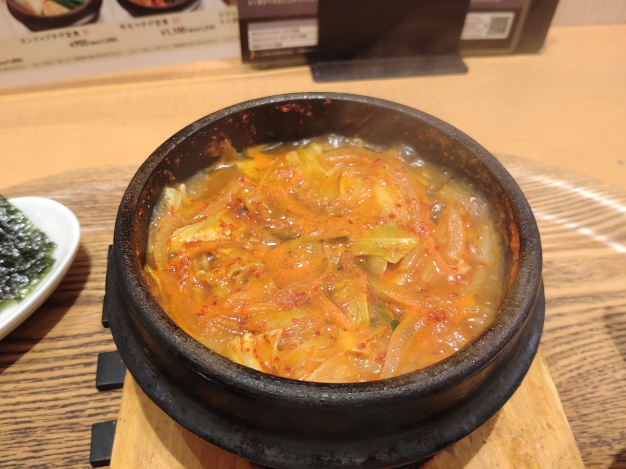 ビビンバにするかチゲにするか迷いましたが、今回は寒い火でもあったので、「牛もつチゲ定食」をオーダー。オーダーから数分、グツグツと煮込んだチゲが届く。器や箸などは韓国で食べたときのもの(ただし、箸は日本人向けに軽くしてある模様)で、雰囲気は韓国。韓国に比べておかずは少ないものの、キムチやナムルは本格的な味。肝心のチゲはグツグツ煮込んであって熱い。辛さに妥協はなく、旨味もしっかりしている。ホルモンも柔らかい。日本人であればこのままご飯をぶち込見たいところだが、ここは韓国風にスプーンで、金属製の器に入ったご飯をスープで浸して食べたい。ただ、食べ進むとやや味が濃い気もした。唐辛子マーク3つつだったので辛さは韓国初級レベルくらい。やはり日本人相手のお店なので、メインは唐辛子マーク1つで、チーズ入りのメニューが多い印象。北海道では唯一の店舗てあり、焼肉以外の韓国料理店はあまり多くない地域であるので、ありがたい存在かも。- 旅行時期