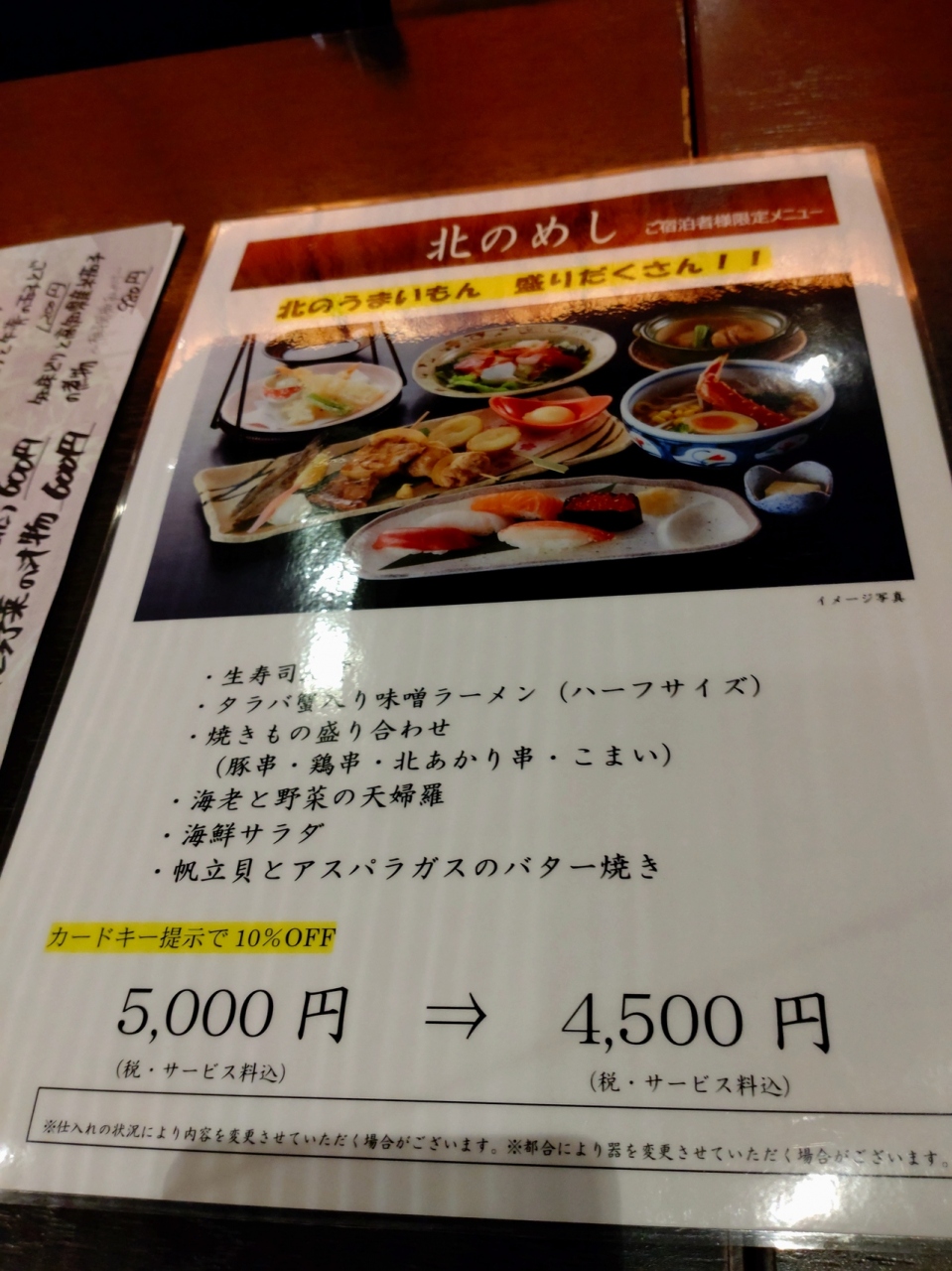 京王プラザホテル札幌の地下1階にある炉端焼きや寿司、北海道料理が楽しめるお店。宿泊者には割引や限定メニューがありお得。あまり天候が良くない日であったので近くで済ませようとしたところ、ホテル内の広告を見て訪問。宿泊者限定の「北のめし」を注文。カートキーの提示で割引になり、コース仕立てで提供されることがポイント。
