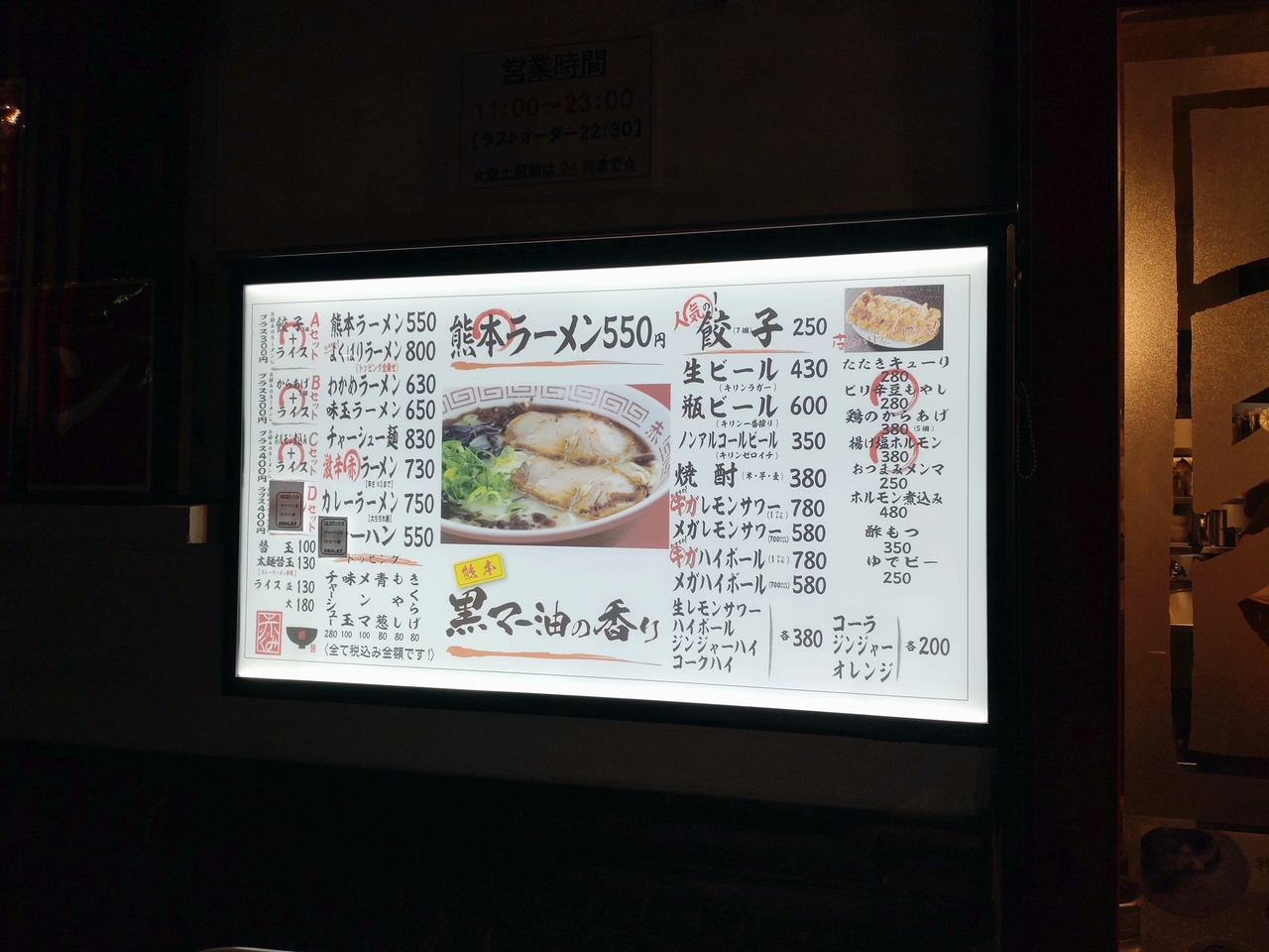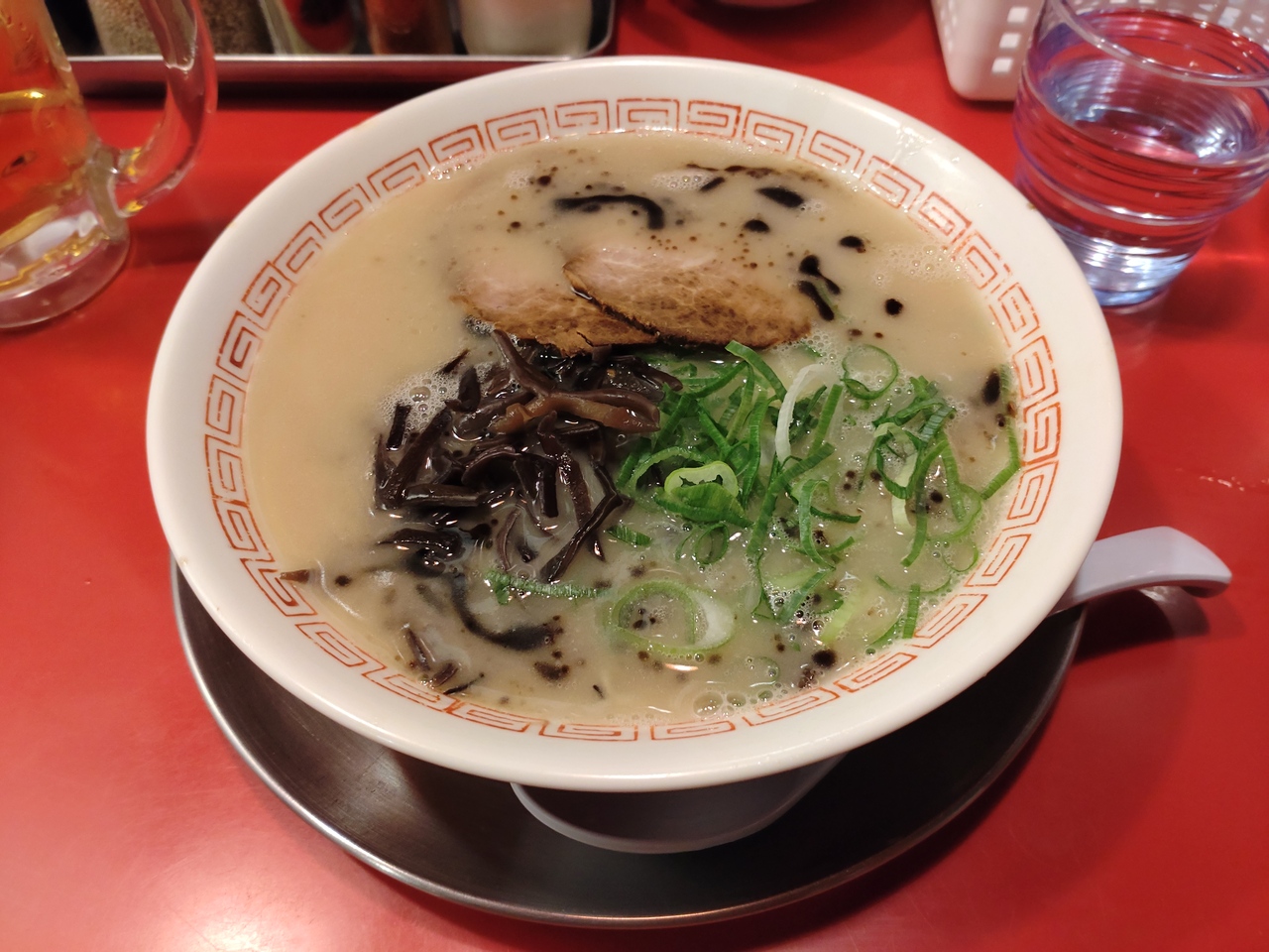 上通アーケードの北、並木坂通りの東側に伸びる上乃裏通りにある熊本ラーメンのお店。上乃裏通りは古い家を改築した隠れ家的な居酒屋やオシャレなバー、雑貨店などさまざまなお店が立ち並ぶ、趣深いスポット。趣のあるお洒落な建物は築180年を超えるもと酒蔵を活用したもの。「赤組」という名前は、火の国、あか牛など熊本をイメージする色「赤」にちなんでとのことですが、提供されるラーメンはマー油の黒が際立ちます。コシのある中太のストレート麺は、少しこってりしたスープにもよく絡み、旨味を感じるバランスの良い味。チャーシューもとろりと柔らかく、キクラゲのコリコリ感の食痕もたまらない。いわば王道の熊本ラーメン。そしてこのお店の嬉しいのは、ラーメンの価格。さすがにワンコインではなくなったものの、熊本ラーメン550円からというのは、大変ありがたい。トッピング全部のせのよくばりラーメンでも800円。サイドメニューの餃子も250円で、酢モツやたたきキュウリ、唐揚げ、ホルモン煮込みなど居酒屋メニューが豊富にあるのも嬉しい。熊本ラーメンでは珍しい替え玉があるのもいい。