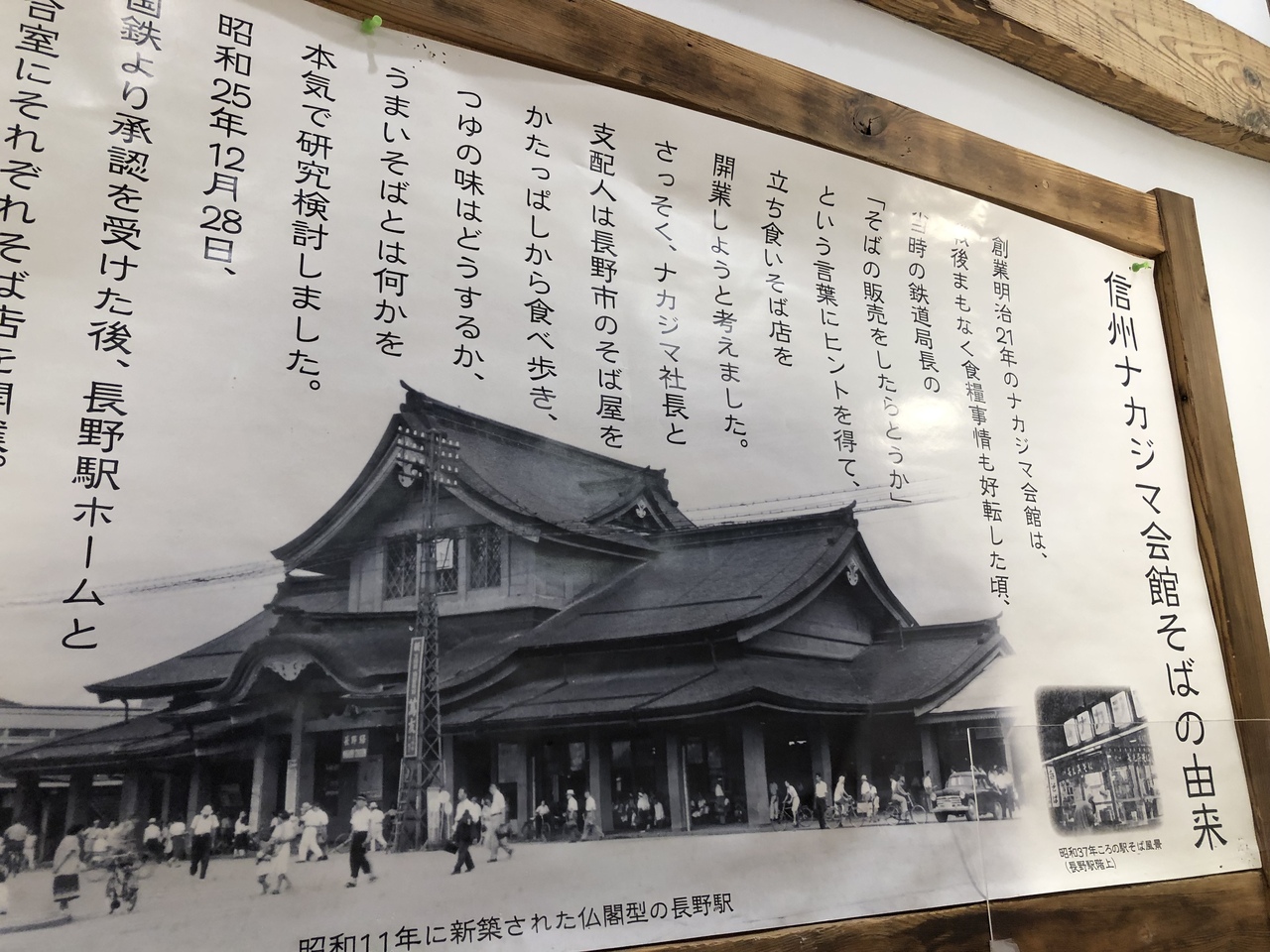 JR長野駅の駅ビルMIDORI2階(コンコース)にあるセルフ式蕎麦店。もともとは中島旅館という地元の旅館が、長野駅開業ともに駅のホームで駅弁の立ち売りを始めたという老舗の会社が経営するお店で、駅そばは昭和29年に長野駅の待合室と上下線ホームに蕎麦店を開業したというから歴史がある。一時は不動産業に特化していたようで、2007年に駅弁とともに撤退していましたが、2015年(平成27年)な北陸新幹線開業とともに今の場所に再びオープンしました。