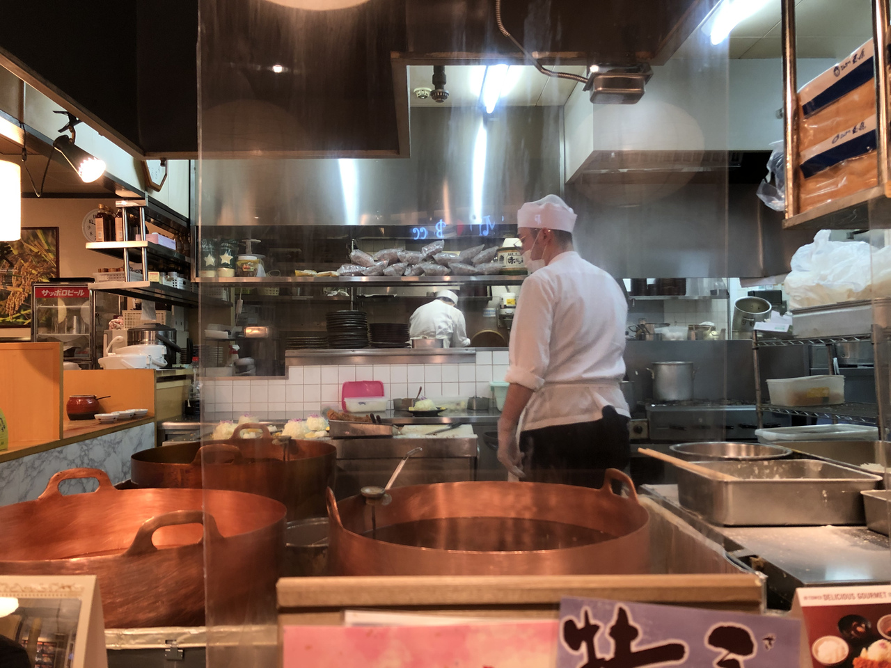 テーブル席とカウンター席の店内は、オープンキッチンスタイルで、とんかつを揚げているところが良く見えます。このお店の特徴は、直径60㎝の大きな銅鍋に40リットルものたっぷりの油でとんかつを揚げるというもの。銅鍋は熱伝導率が良いことから柔らかくジューシーに揚がるそうです。