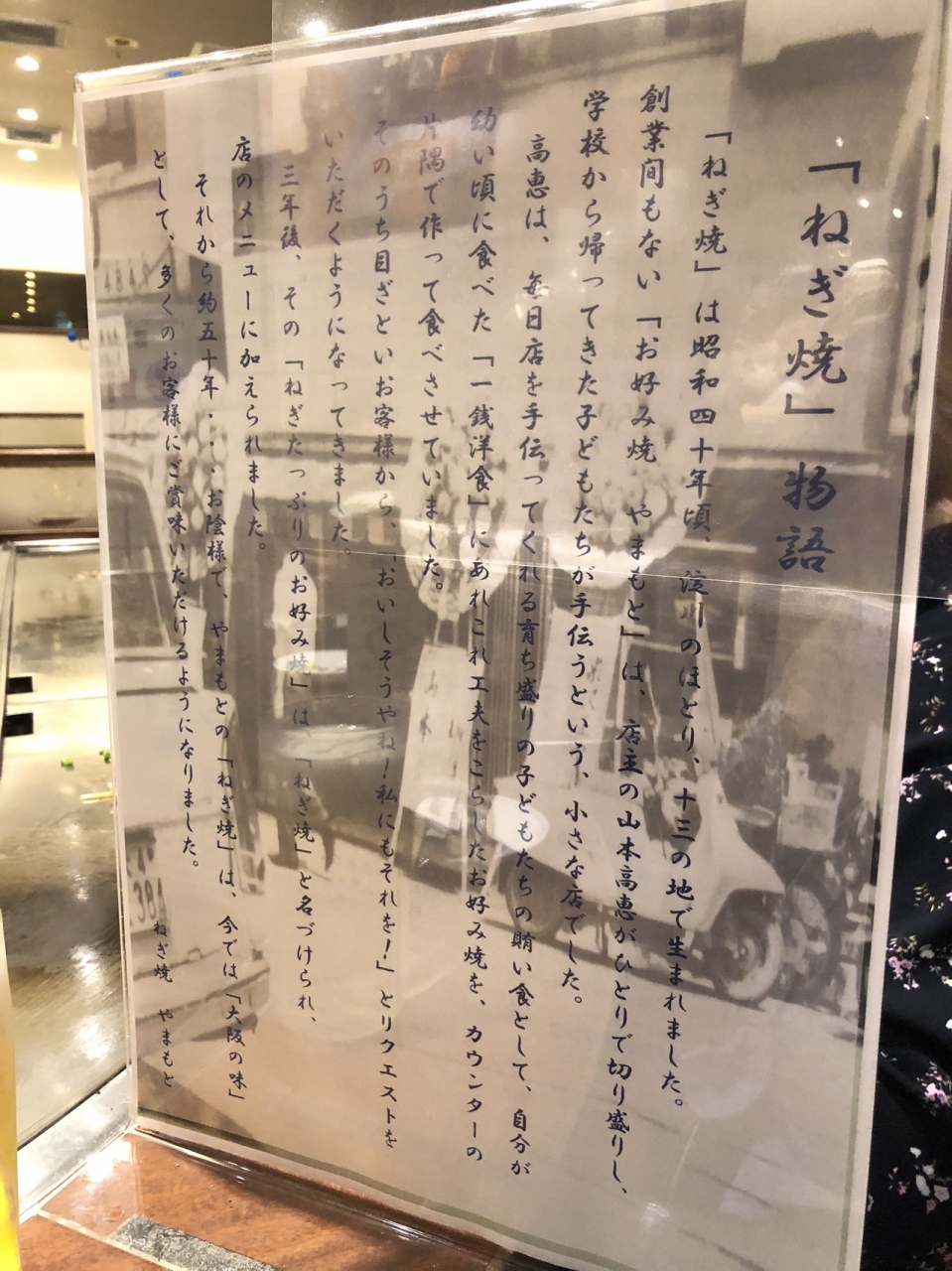 阪急大阪梅田駅からすぐ、JR京都線の高架下にある「梅田エストワン」にあるお好み焼きの店。淀川区の十三で1965年(昭和40年)創業したねぎ焼発祥のお店の支店の一つ。ねぎ焼は、もともとこのお店の女性の主人が自身と子供の昼食のために作っていたものを常連客が見て、メニュー化に至ったと言われています。