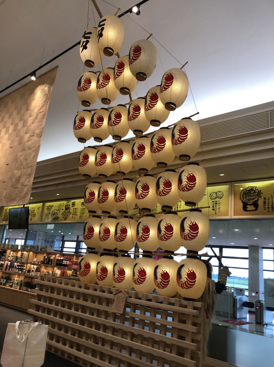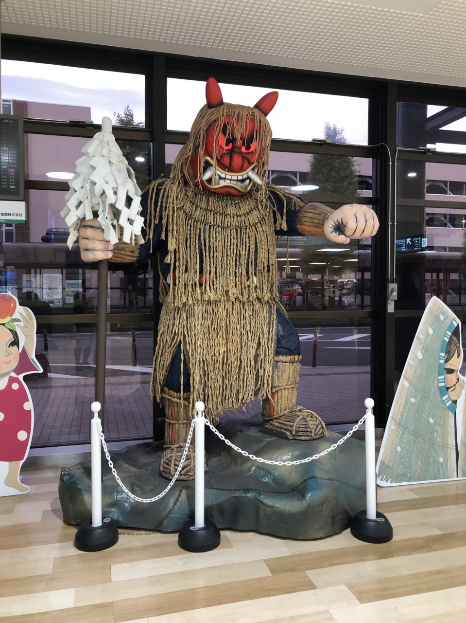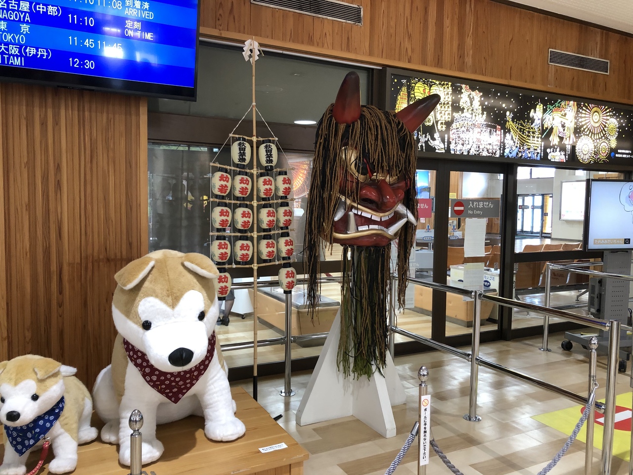 空港内は、秋田杉を使った装飾のタラップが3つ、ロビー全体も秋田杉をふんだんに使っており、暖かさを感じます。大型のオブジェもあるほか、東北三大祭りの一つ秋田・竿灯の実寸大のモデル、エスカレーター前には巨大なナマハゲのオブジェ、さらに秋田県出身の矢口高雄さんの代表作「釣りキチ三平」の陶板レリーフ