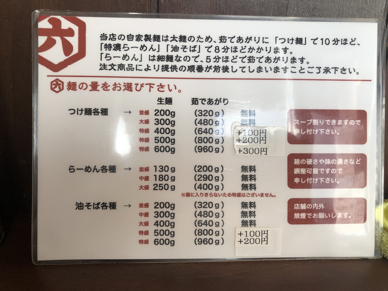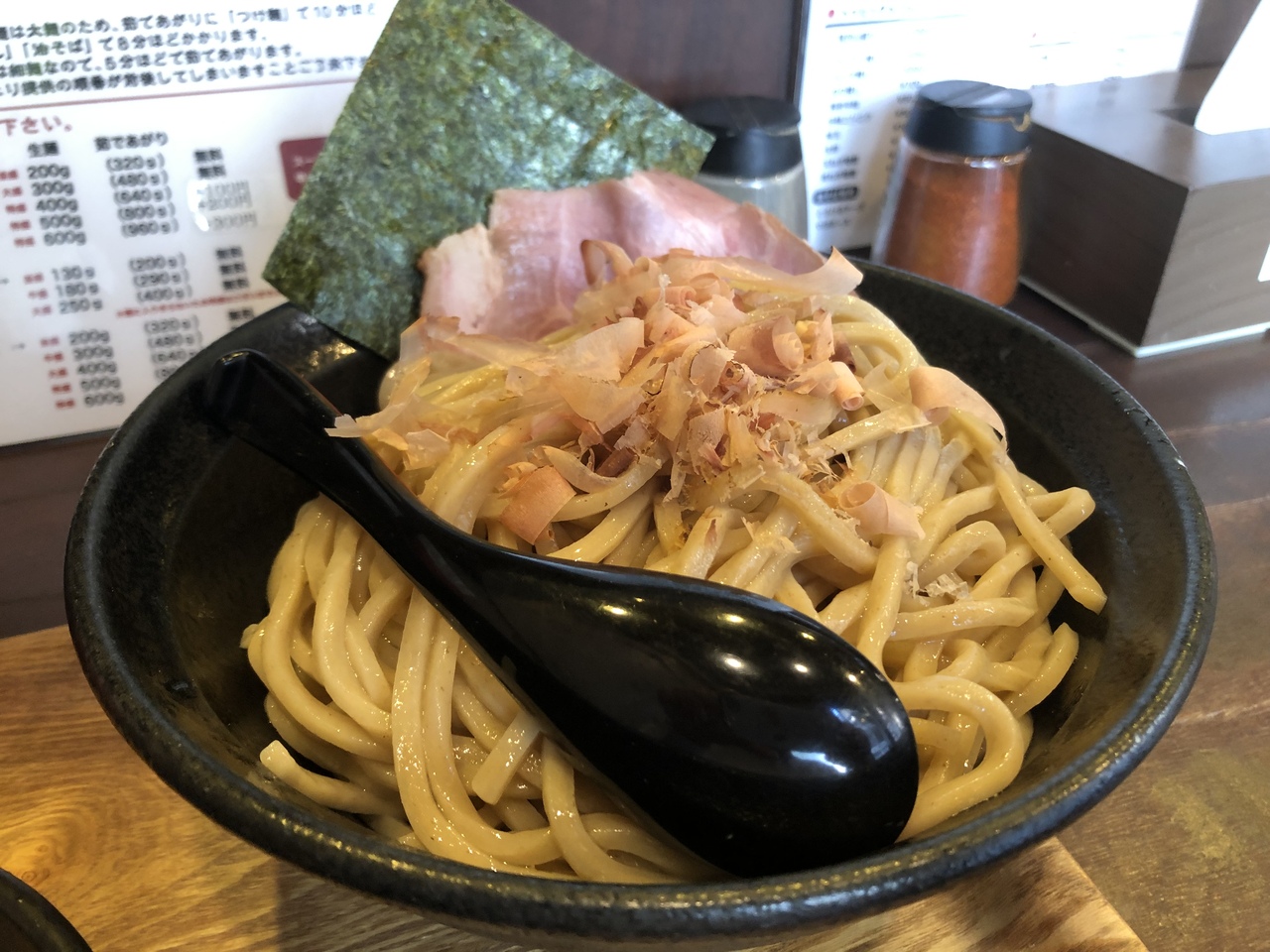 つけ麺、ラーメン、油そばとありますが、やはりここはつけ麺に。ちなみに普通盛りが200gで、茹で上がりは320g。大盛り300gまでは無料で、その先は600gまで、100g毎に100円プラス。600gだと茹で上がりは960gだから、どうなってしまうか心配。ちなみにおかわりのつけ汁もある。トッピングもありますが、ここは特に頼まず。自家製麺で太麺。そのため茹で上がりに10分程度かかる。