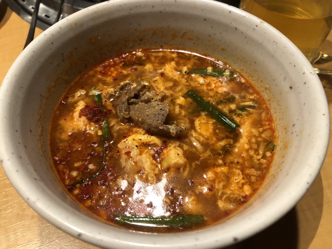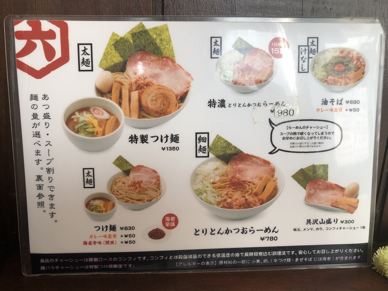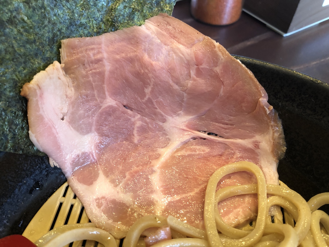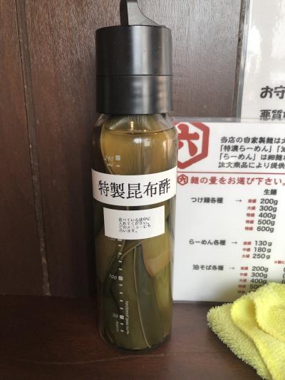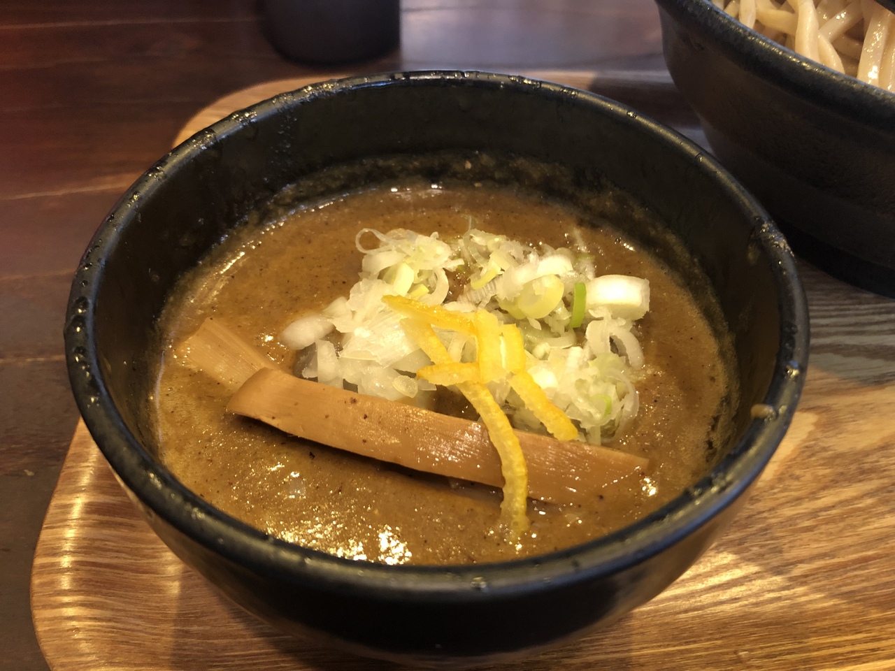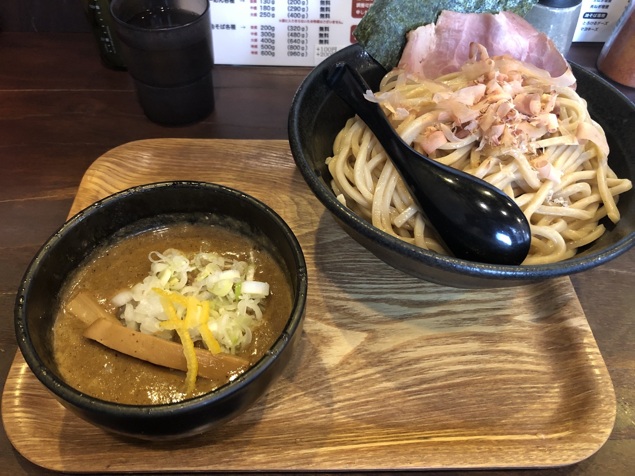 どんぶりで提供される麺は結構なインパクト。ただ、後で食べていくと上底になっているので安心する。麺はかなりのモチモチ感があり、コシのあるタイプの麺はうどん並に太い。かなり水で締められていて、ヒヤヒヤ。一方、つけ汁は、熱々でかなりの粘土があり、麺に絡むとかそういうところを超えている。「汁」というイメージではなくポタージュスープ以上の濃さ。枕崎産鰹節をはじめとした魚介系と豚骨を合わせたスープですが、魚介が強め。特製の昆布酢をかけると味変して、大盛りでもなんなく食べられました。最後にスープ割にしましたが、それでもかなりの粘度が残っていました。また、焼豚がローストビーフなような赤みの入ったもので美味。これだけでも勝負できるかと。- 旅行時期